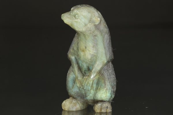 Umně vyřezaná soška vzpřímené surikaty zhotovená z přírodního labradoritu s nádhernými iridiscentními barvami v odstínech modré a zelené.