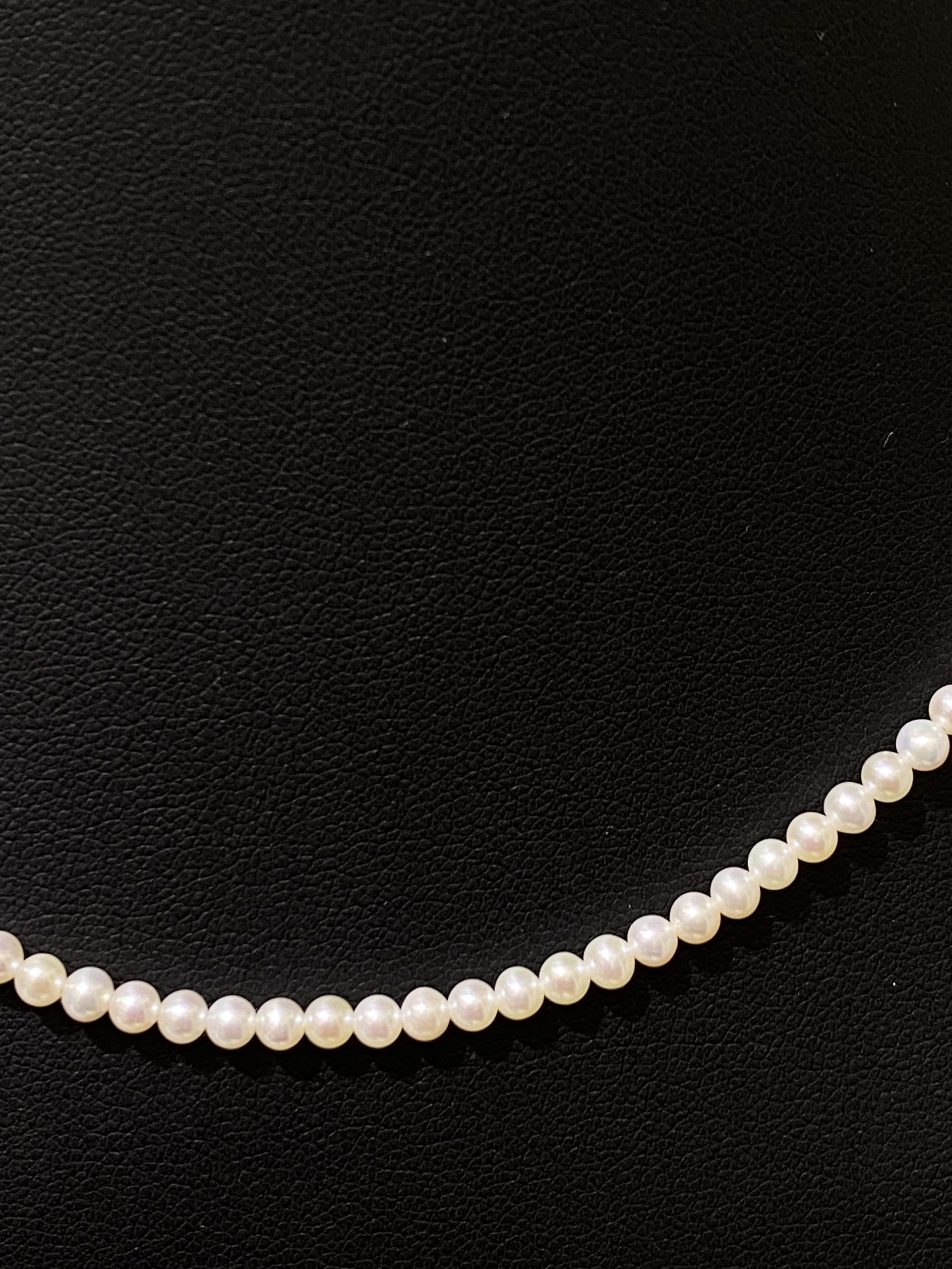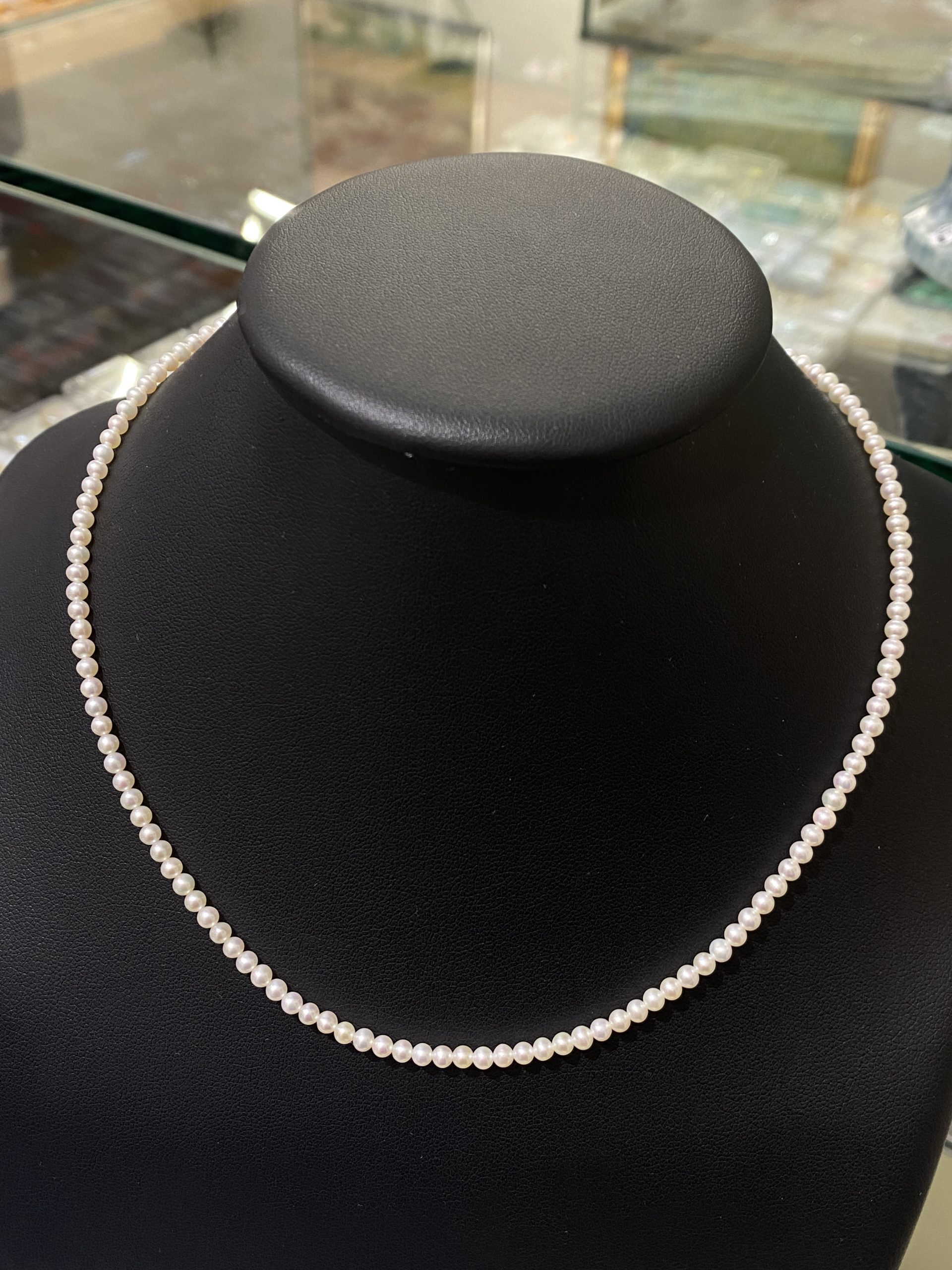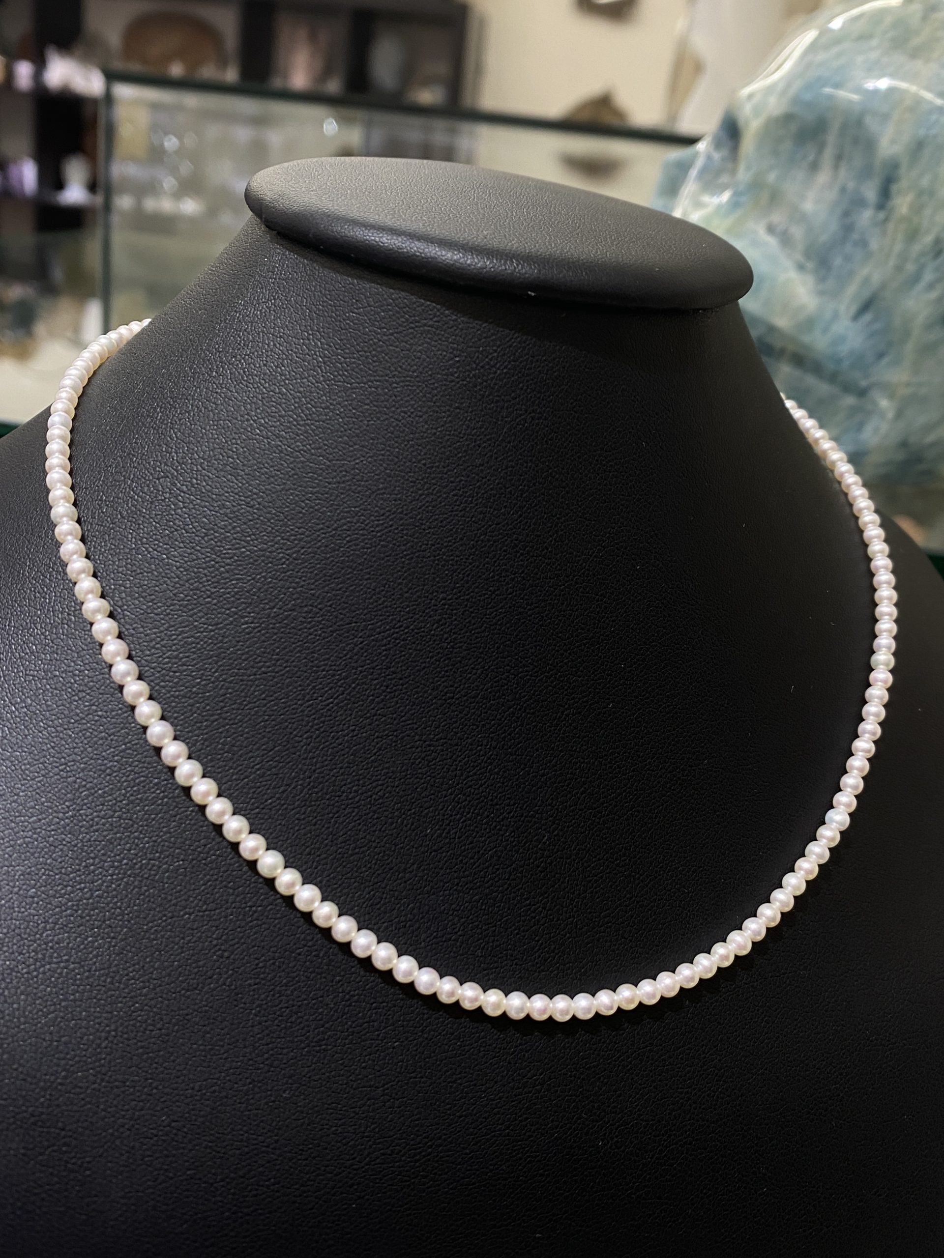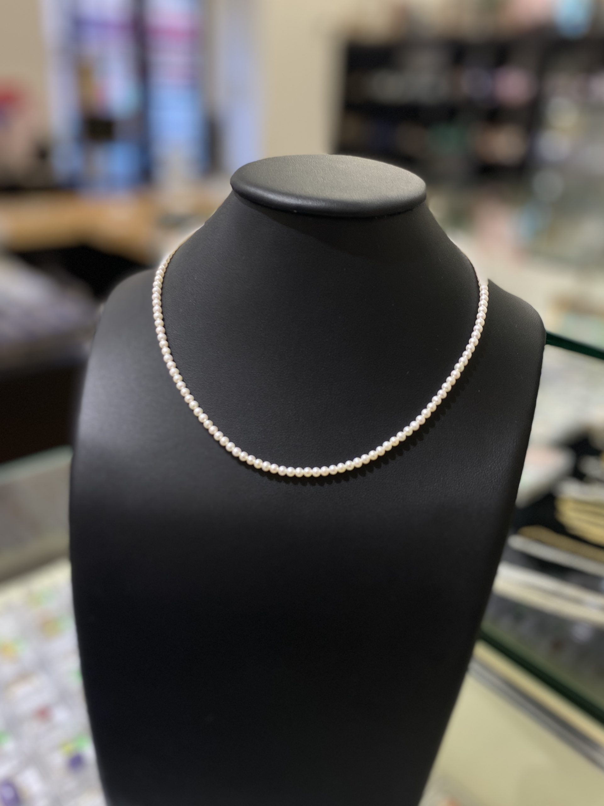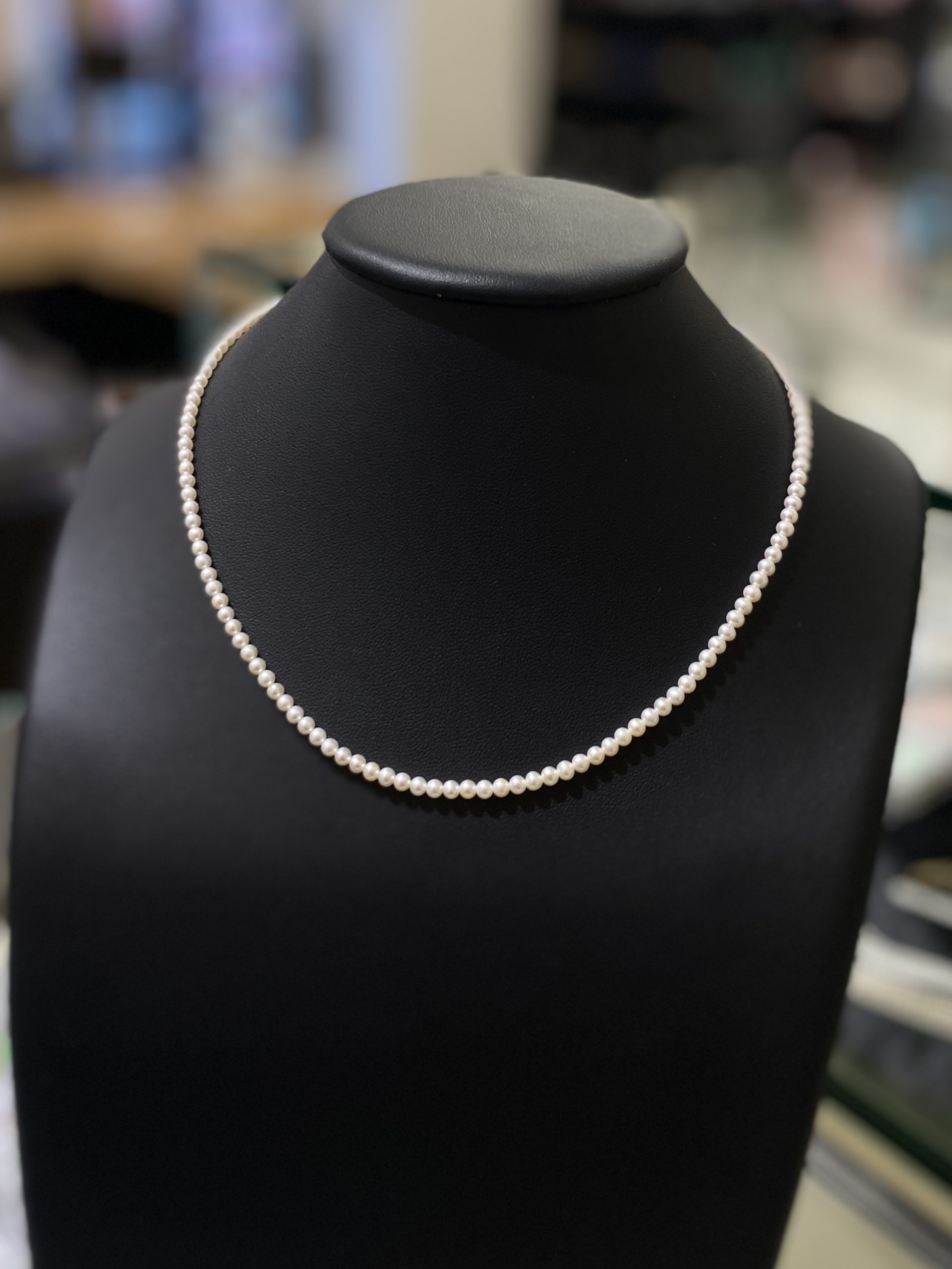 Nadčasově elegantní náhrdelník z drobounkých sladkovodních kultivovaných perel o velikosti 3 mm, které dodávají šperku jemný a něžný vzhled. Perly nejsou uzlíkované a jsou navlečené na hedvábném vláknu.