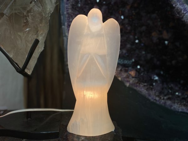 Nádherná socha anděla vyřezaná z jednoho kusu vláknité hedvábně lesklé odrůdy sádrovce – selenitu, který zároveň funguje jako krásná lampička. Foto je ilustrativní a jednotlivé kusy se mohou drobně lišit.