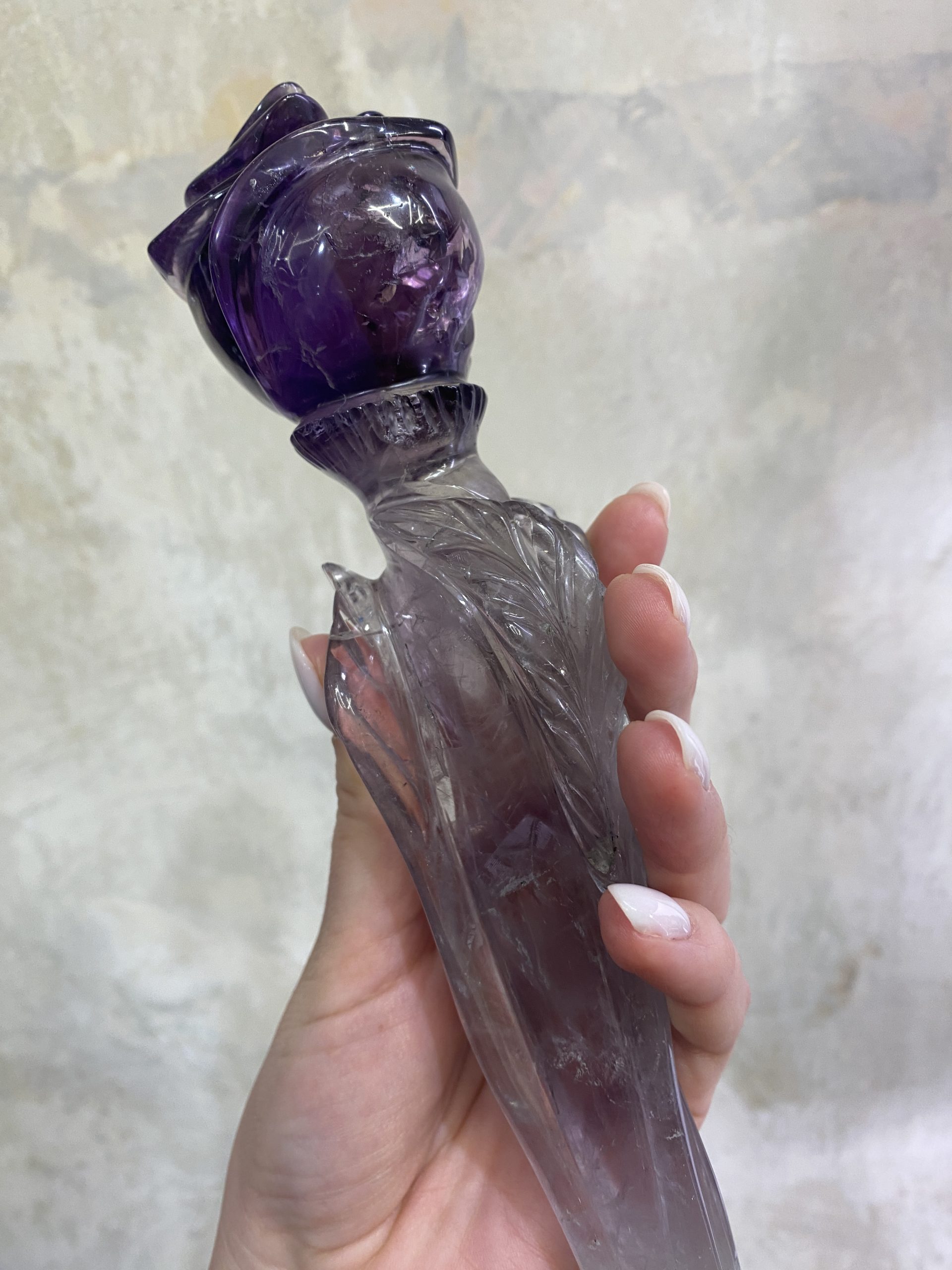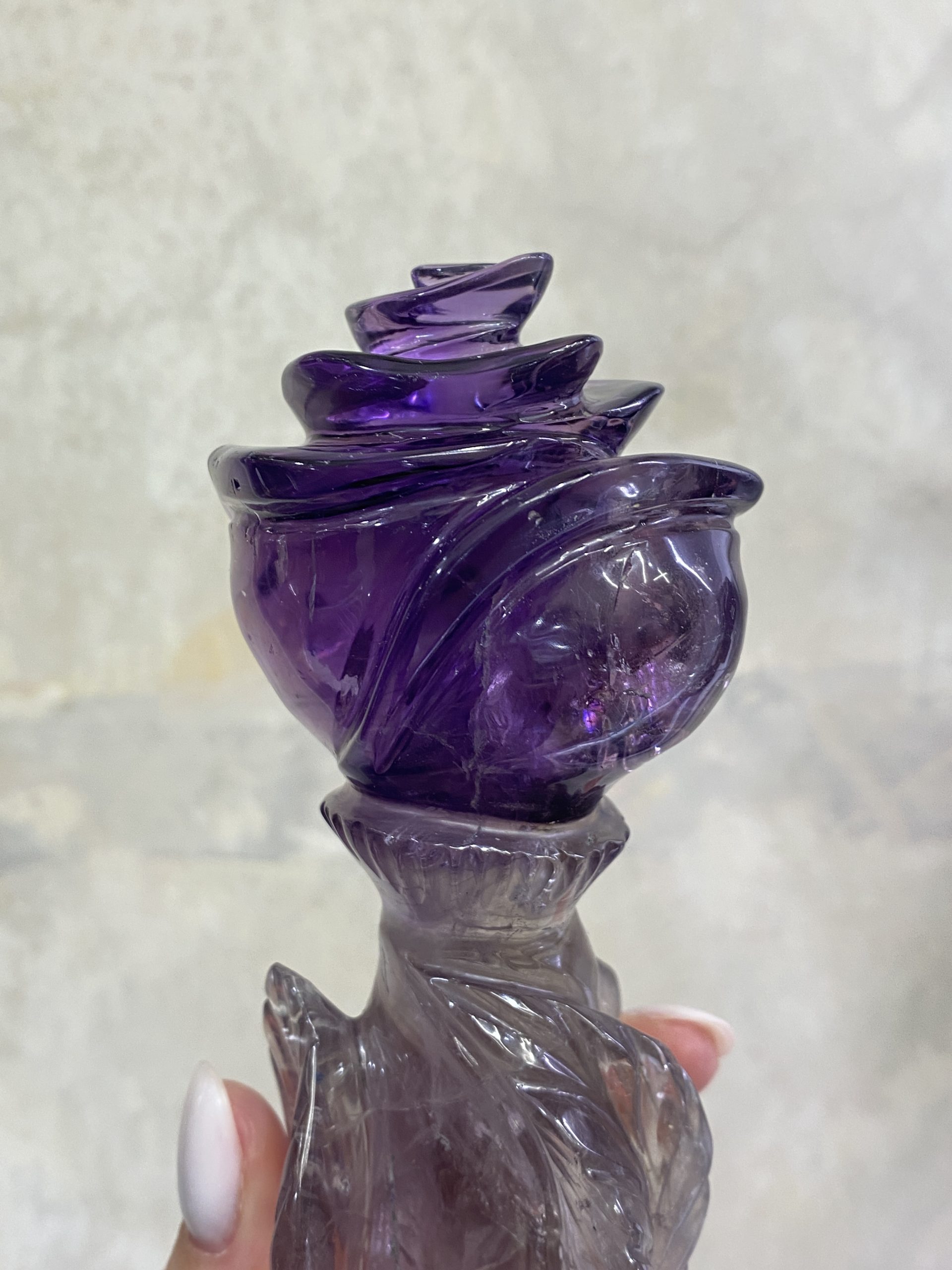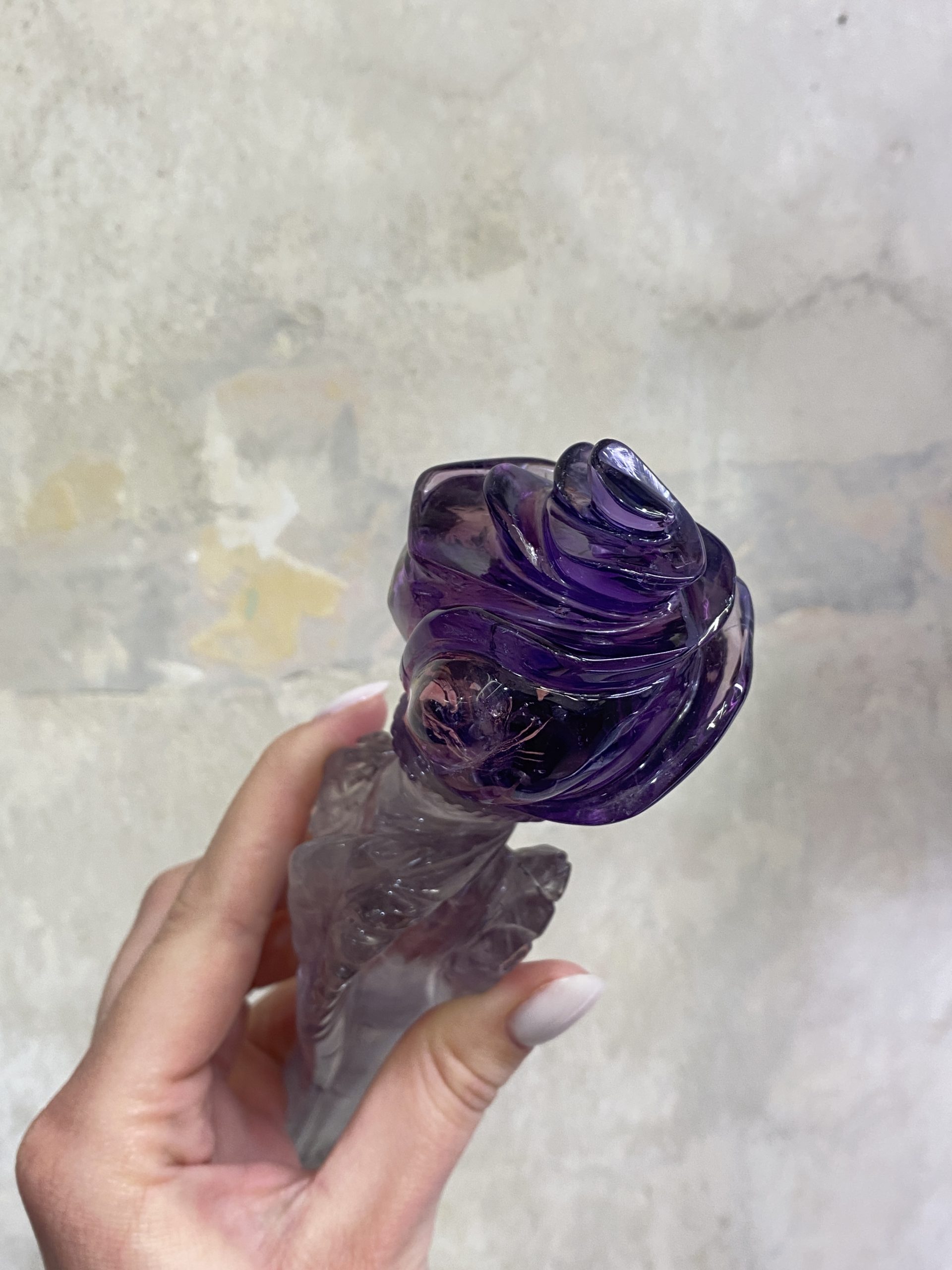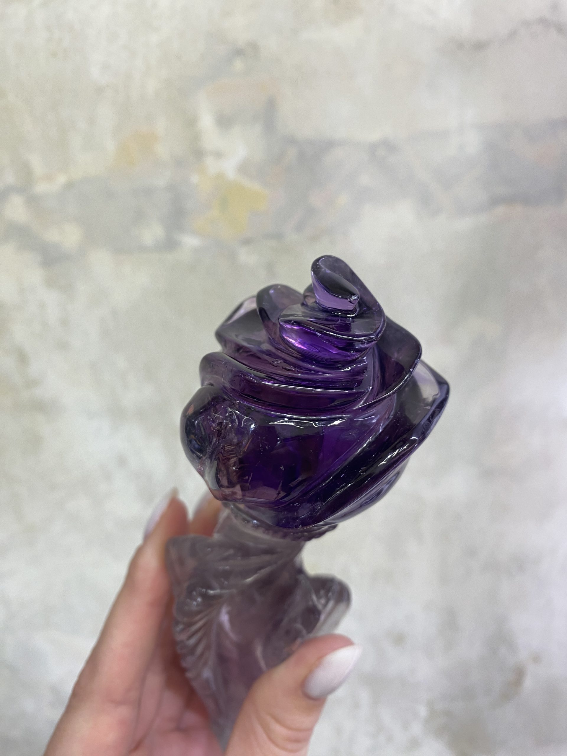 Nádherná propracovaná růže, vyřezaná z jednoho kusu krásně sytě fialového ametystu. Překrásně ozdobí interiér.