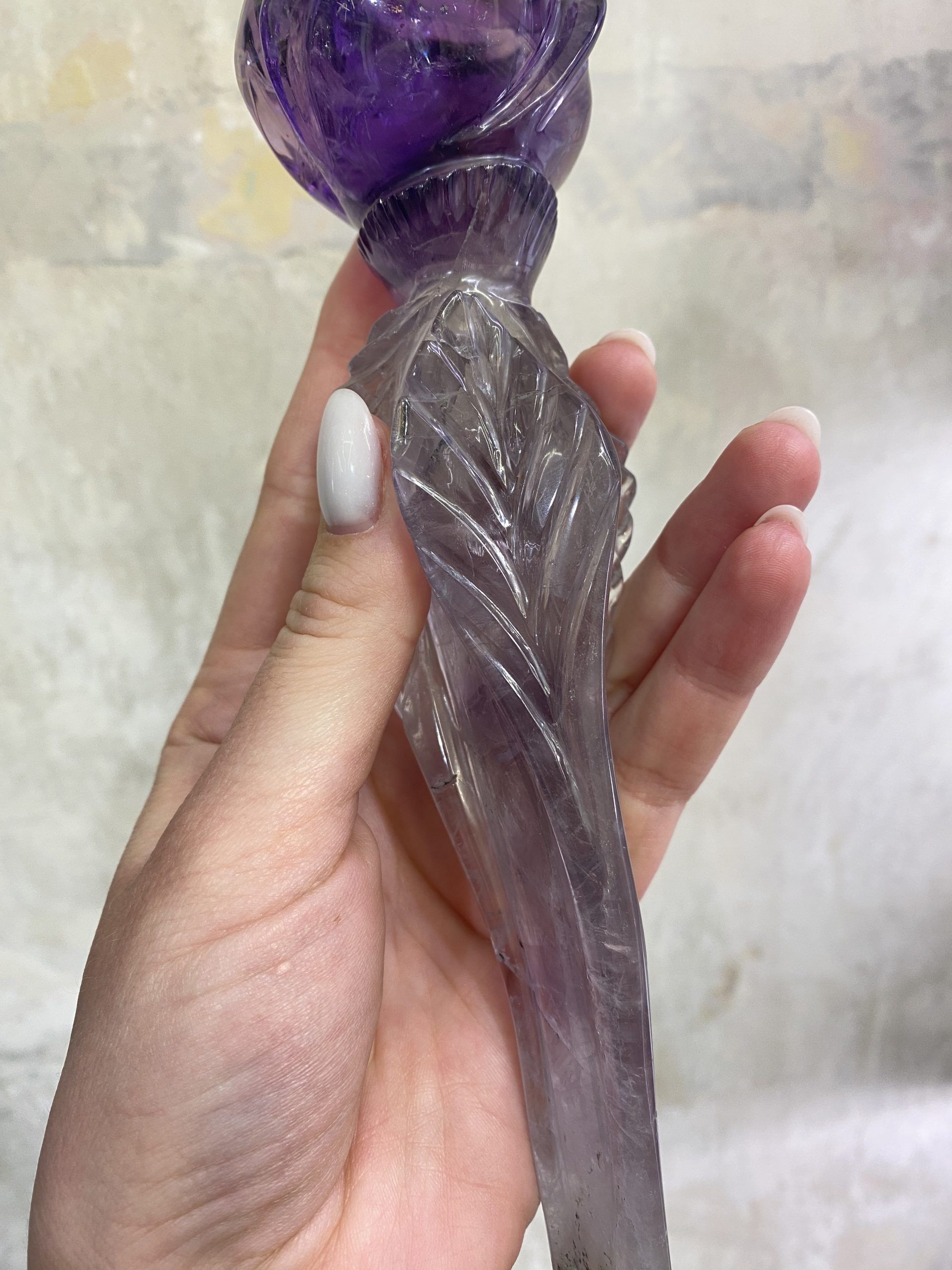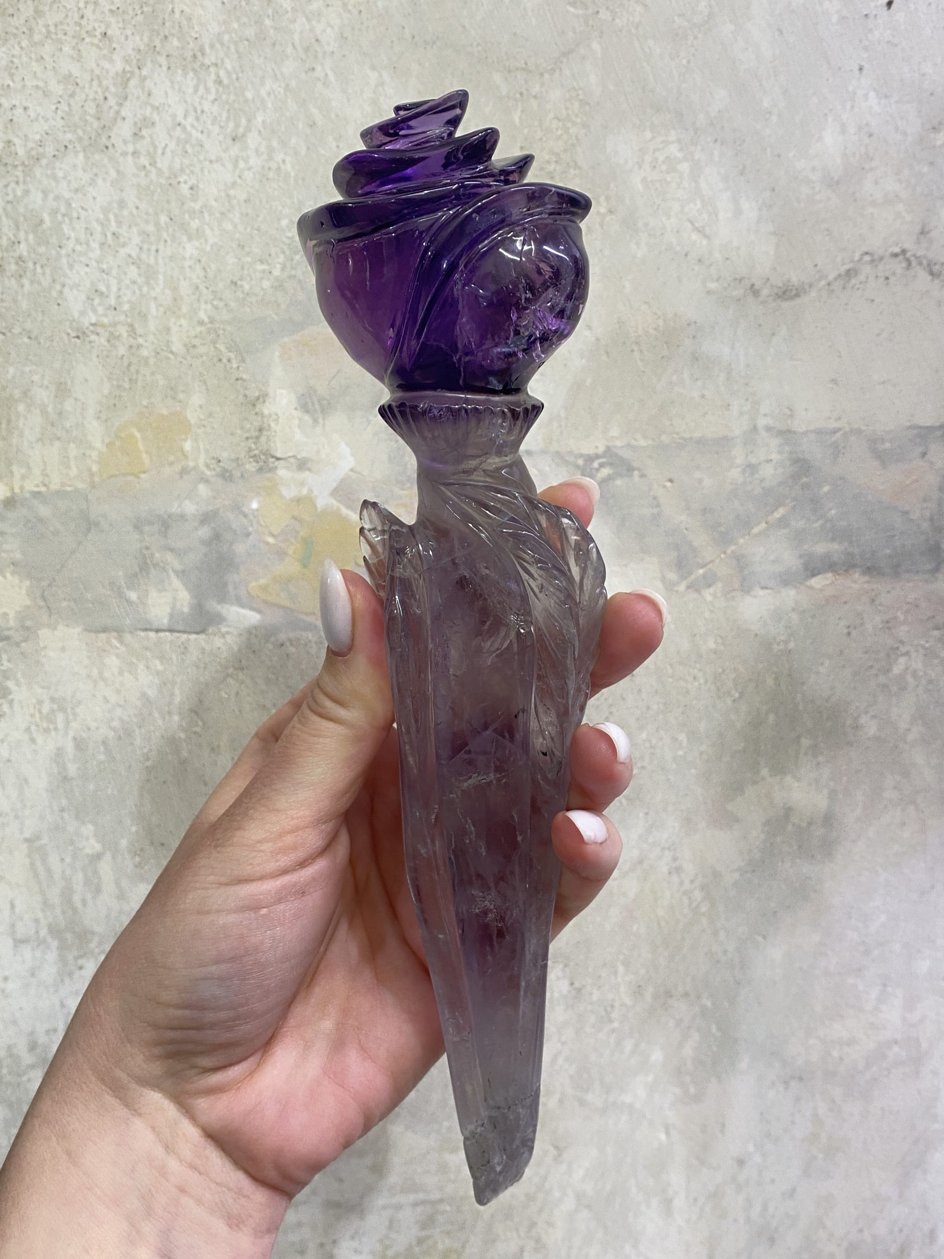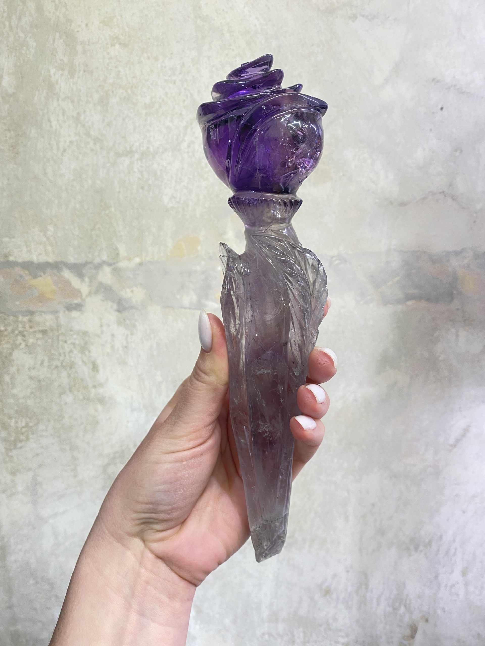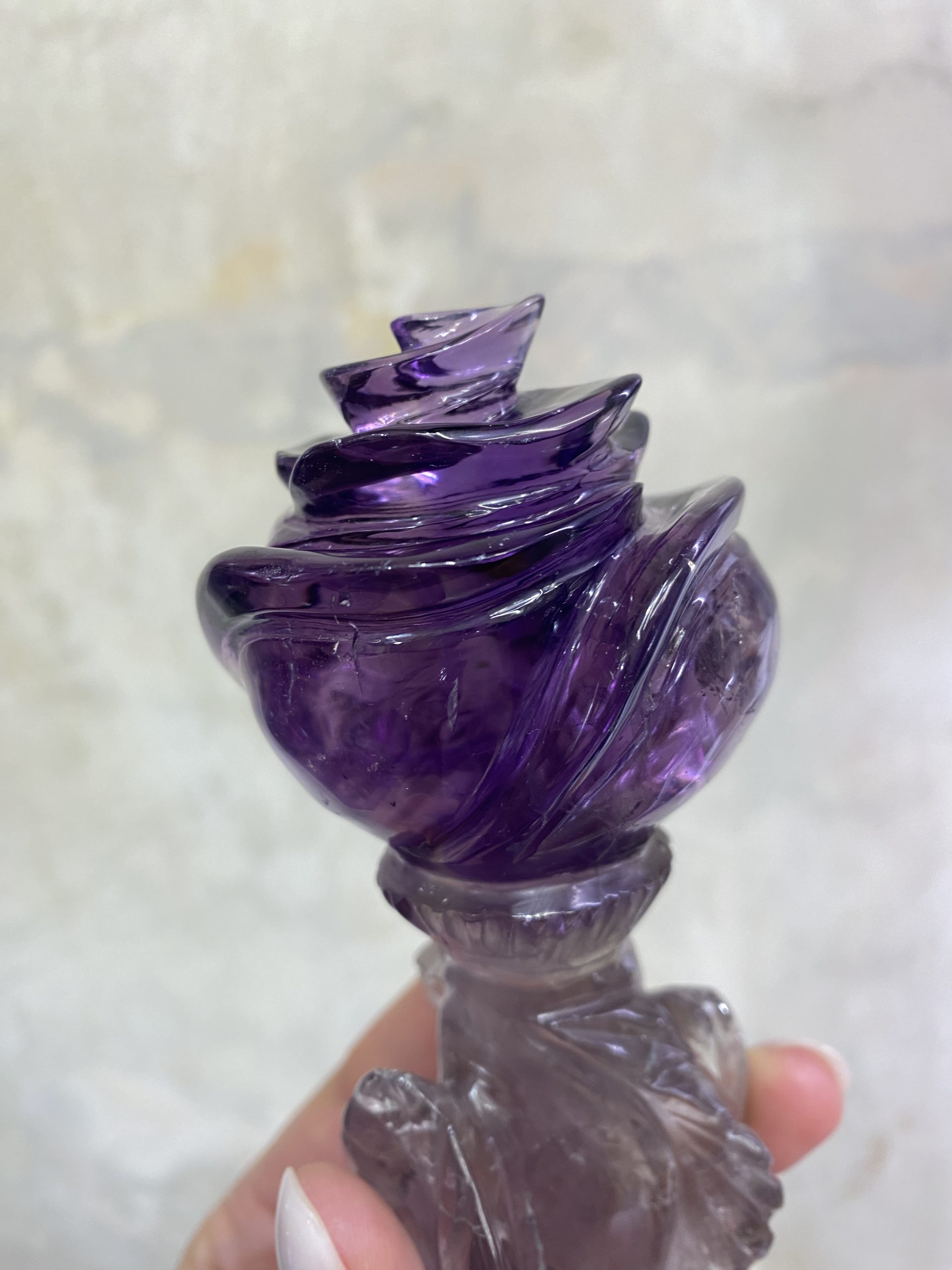 Nádherná propracovaná růže, vyřezaná z jednoho kusu krásně sytě fialového ametystu. Překrásně ozdobí interiér.