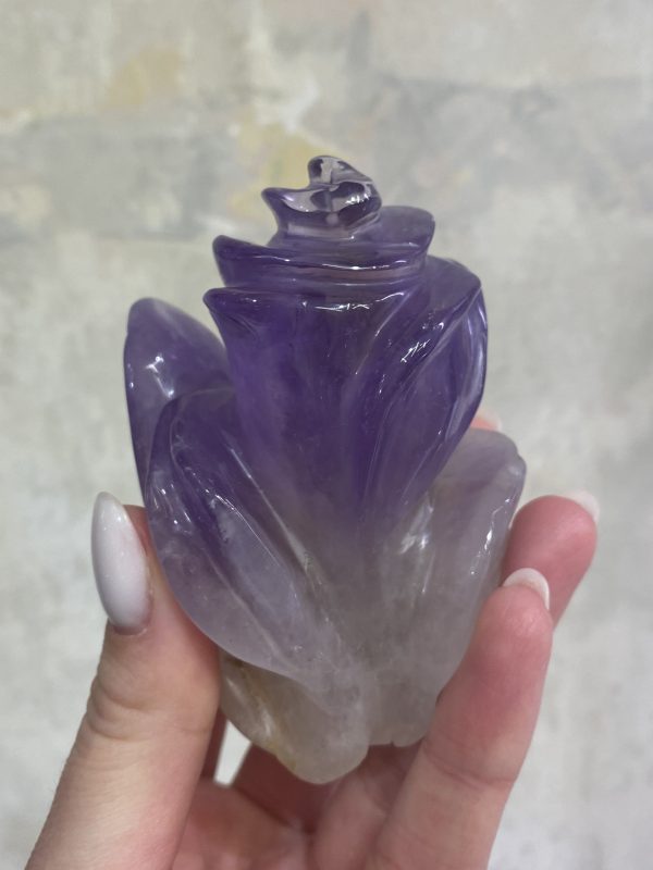Nádherná něžná soška růže vyřezaná z ametystu, přecházející do čirého křišťálu. Soška krásně ozdobí každý interiér.