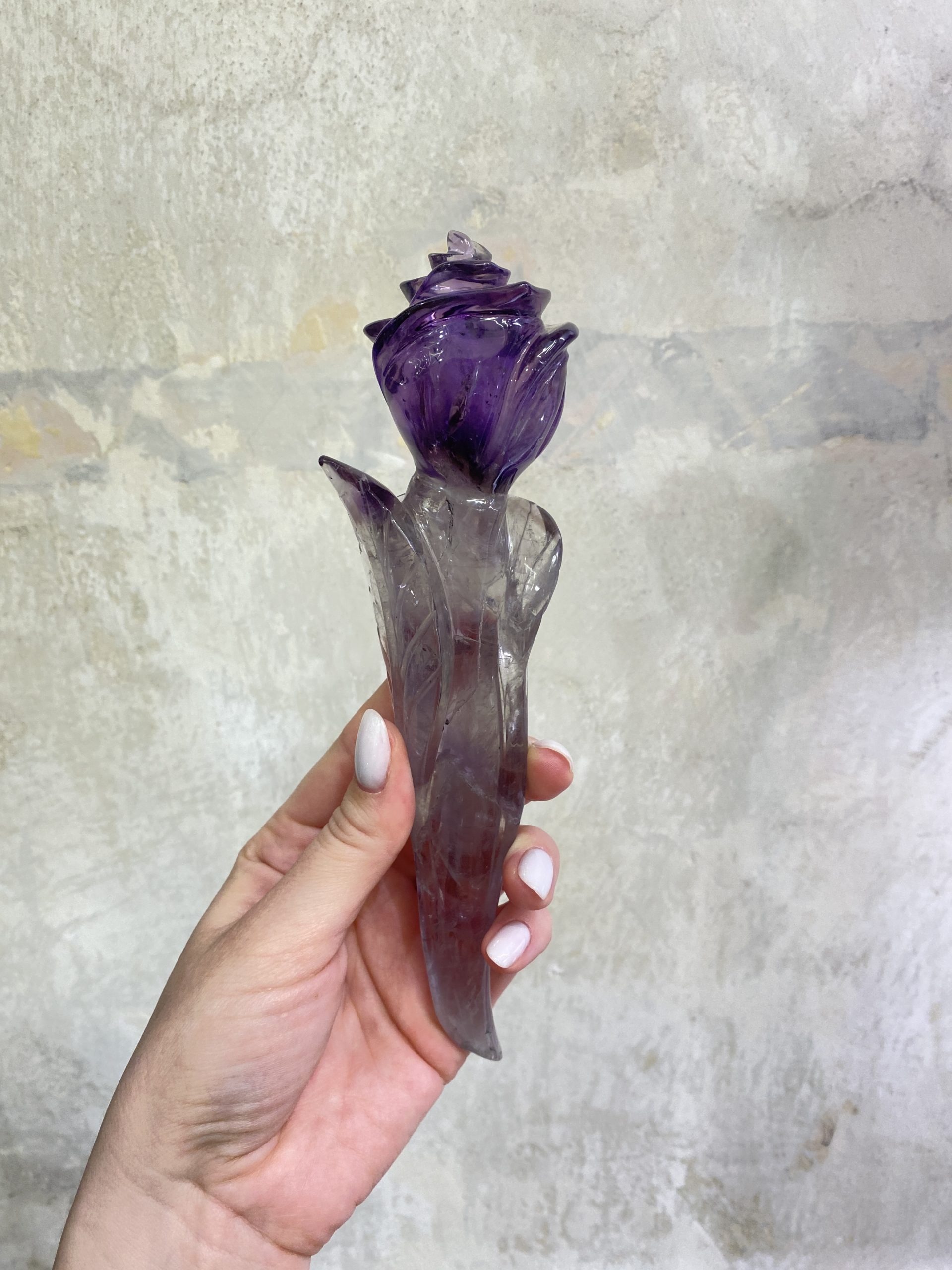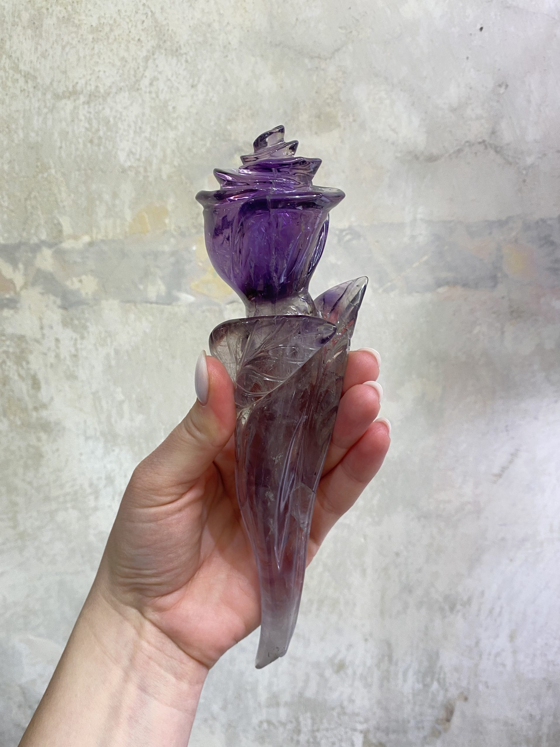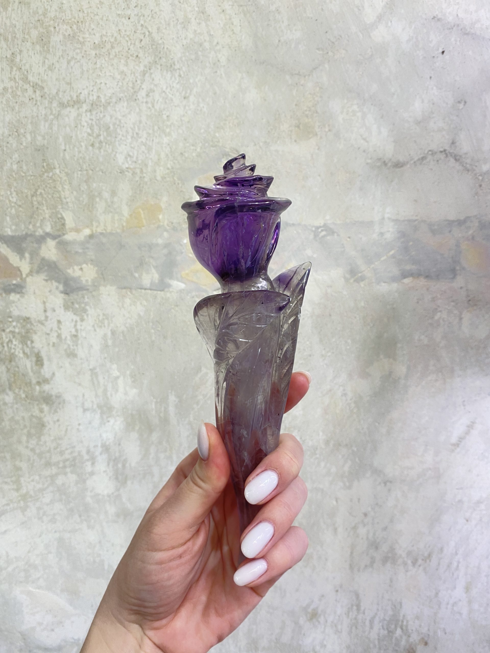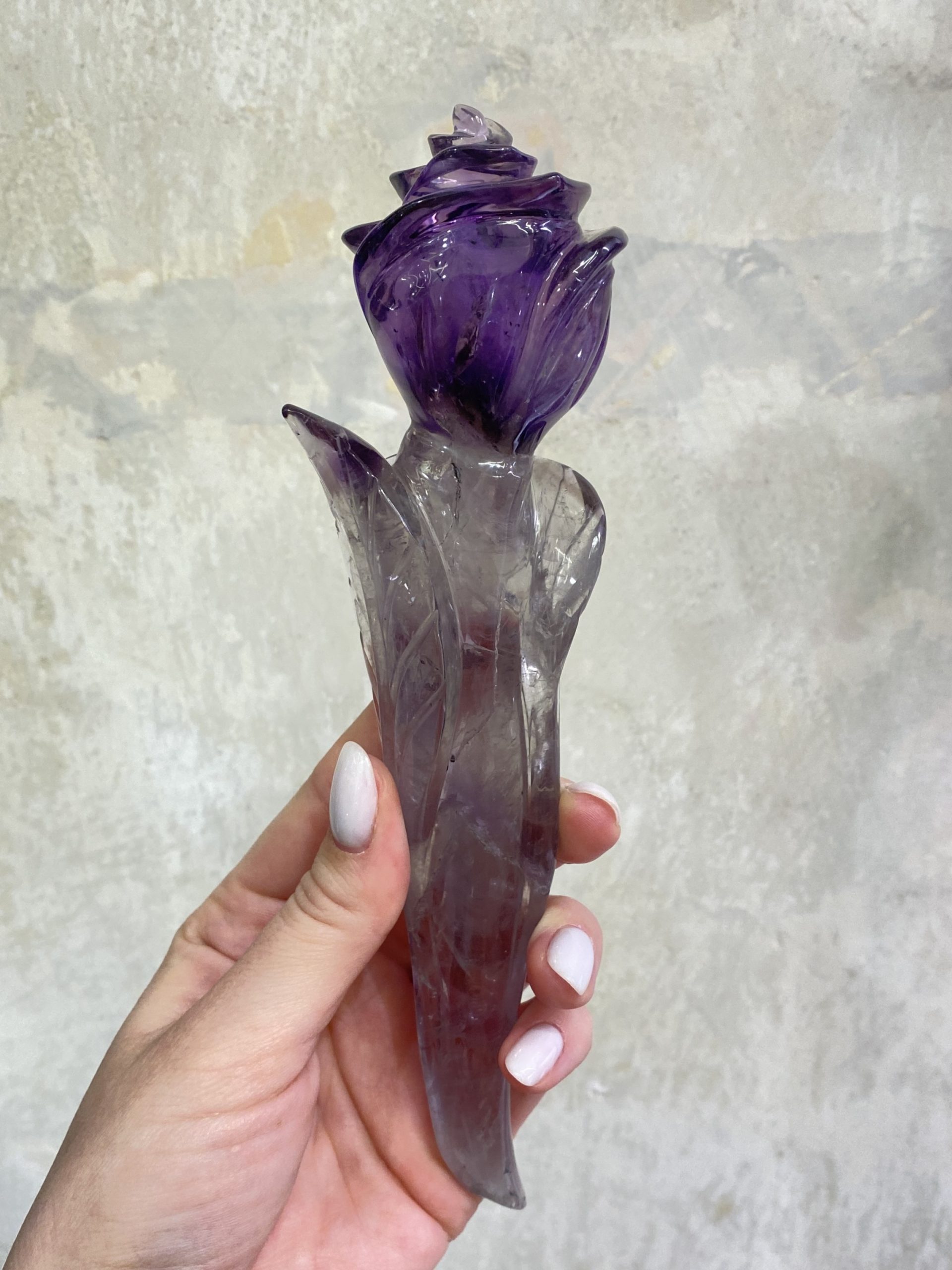 Nádherná růže, vyřezaná z jednoho kusu krásně sytě fialového ametystu. Překrásně ozdobí interiér.