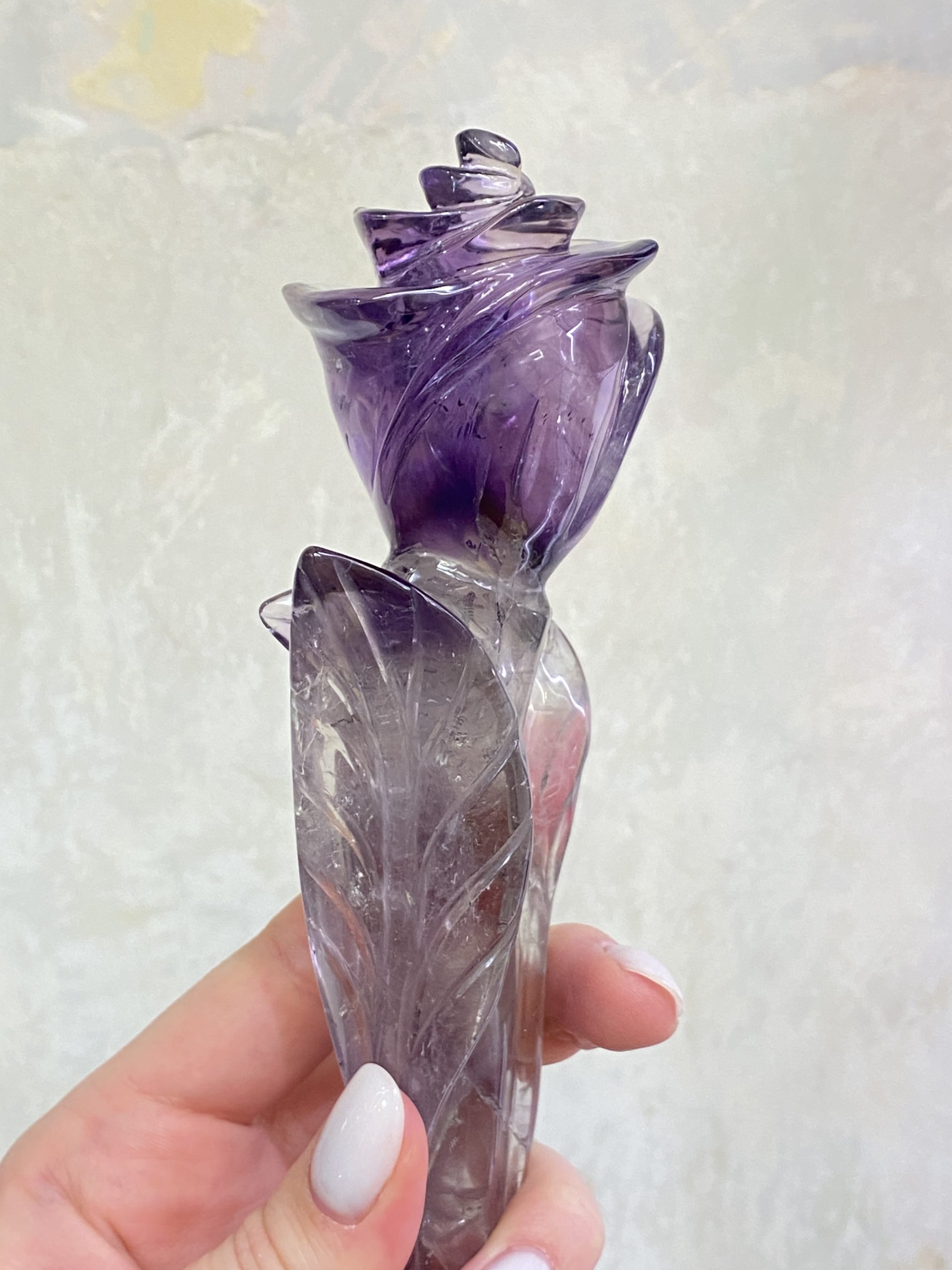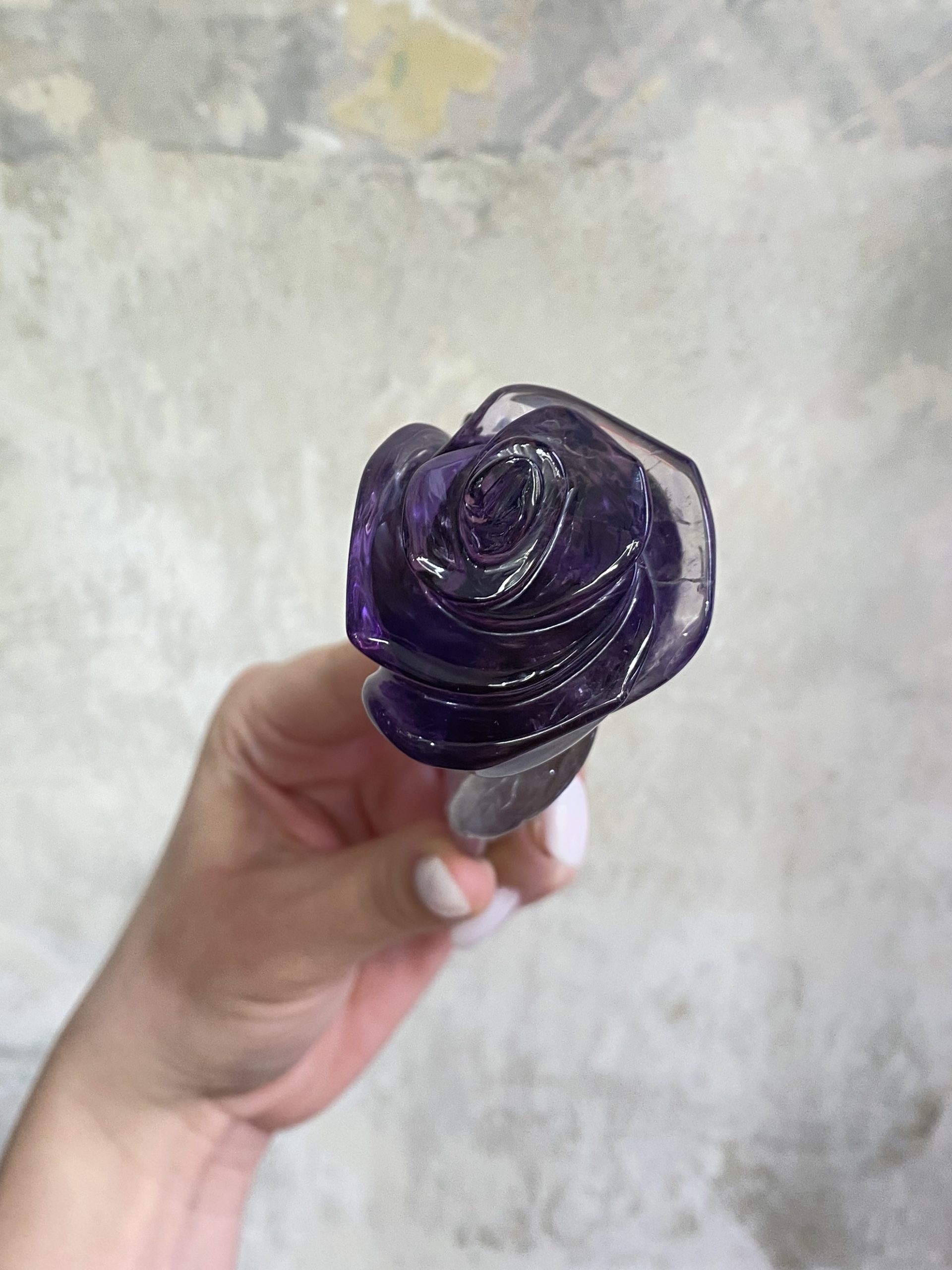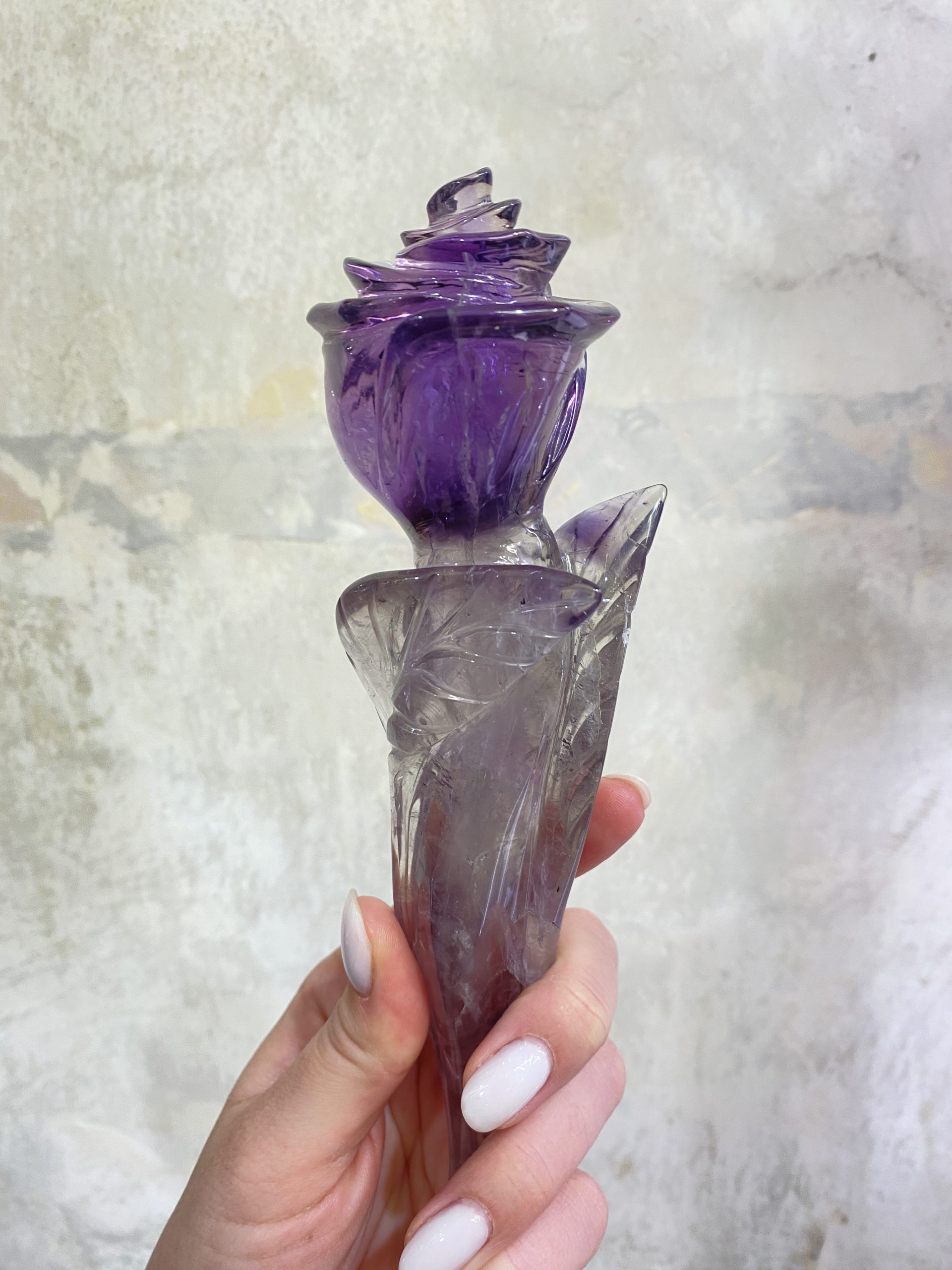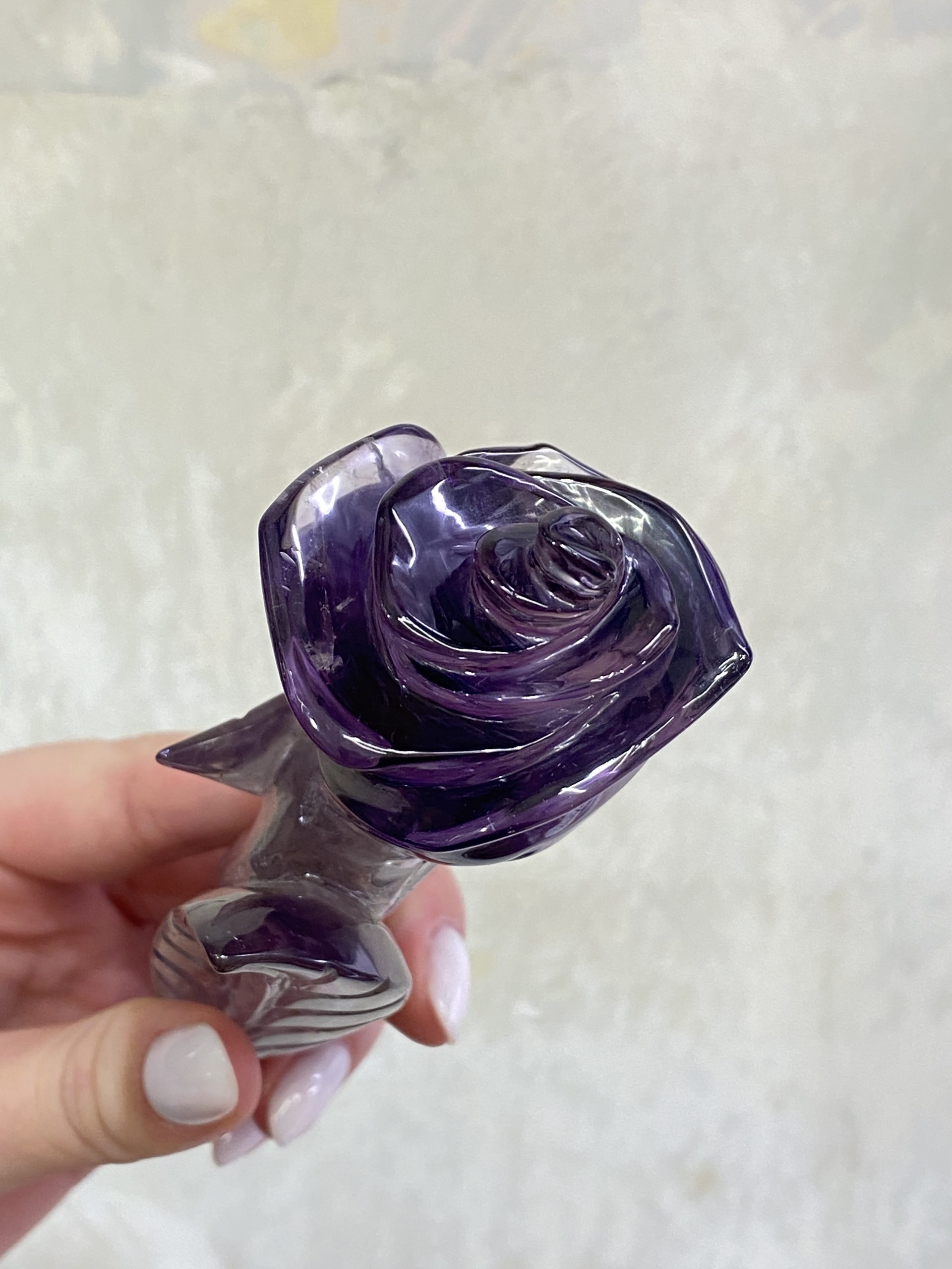 Nádherná růže, vyřezaná z jednoho kusu krásně sytě fialového ametystu. Překrásně ozdobí interiér.
