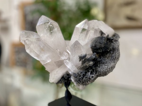 Nádherná velká ukázka křišťálové drúzy. Vzorek tvoří velké krystaly, které srůstají v překrásné kompozici. Vzorek je uchycený v černém, kovovém stojánku, který je součástí produktu.