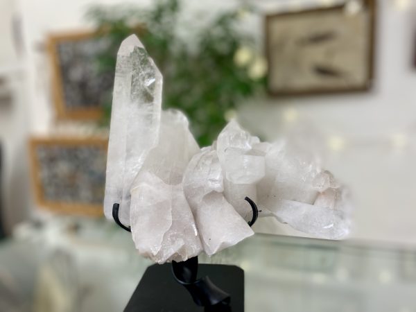 Nádherná velká ukázka křišťálové drúzy. Vzorek tvoří velké krystaly, které srůstají v překrásné kompozici, s jedním hlavním krystalem jako dominantou. Vzorek je uchycený v černém, kovovém stojánku, který je součástí produktu.