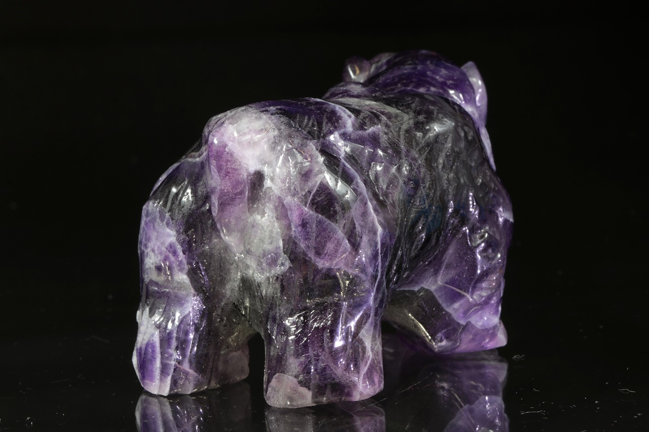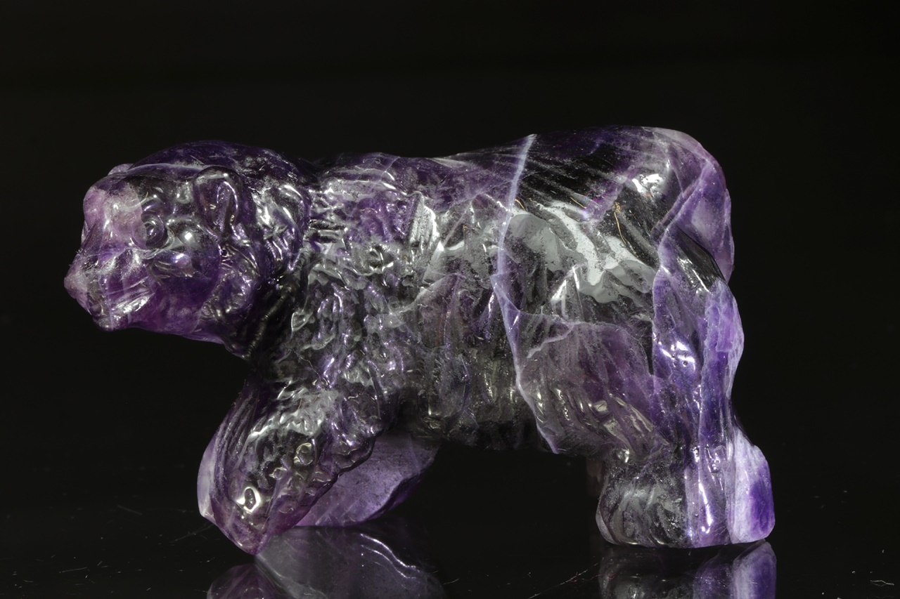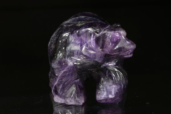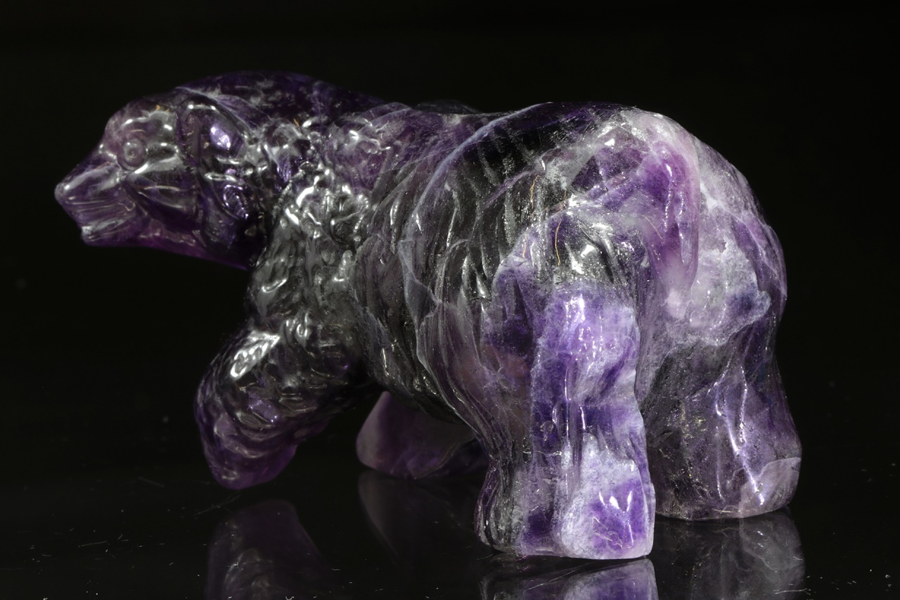 Nádherná, velmi věrně vyřezaná socha medvěda z přírodního intenzivně fialového fluoritu.