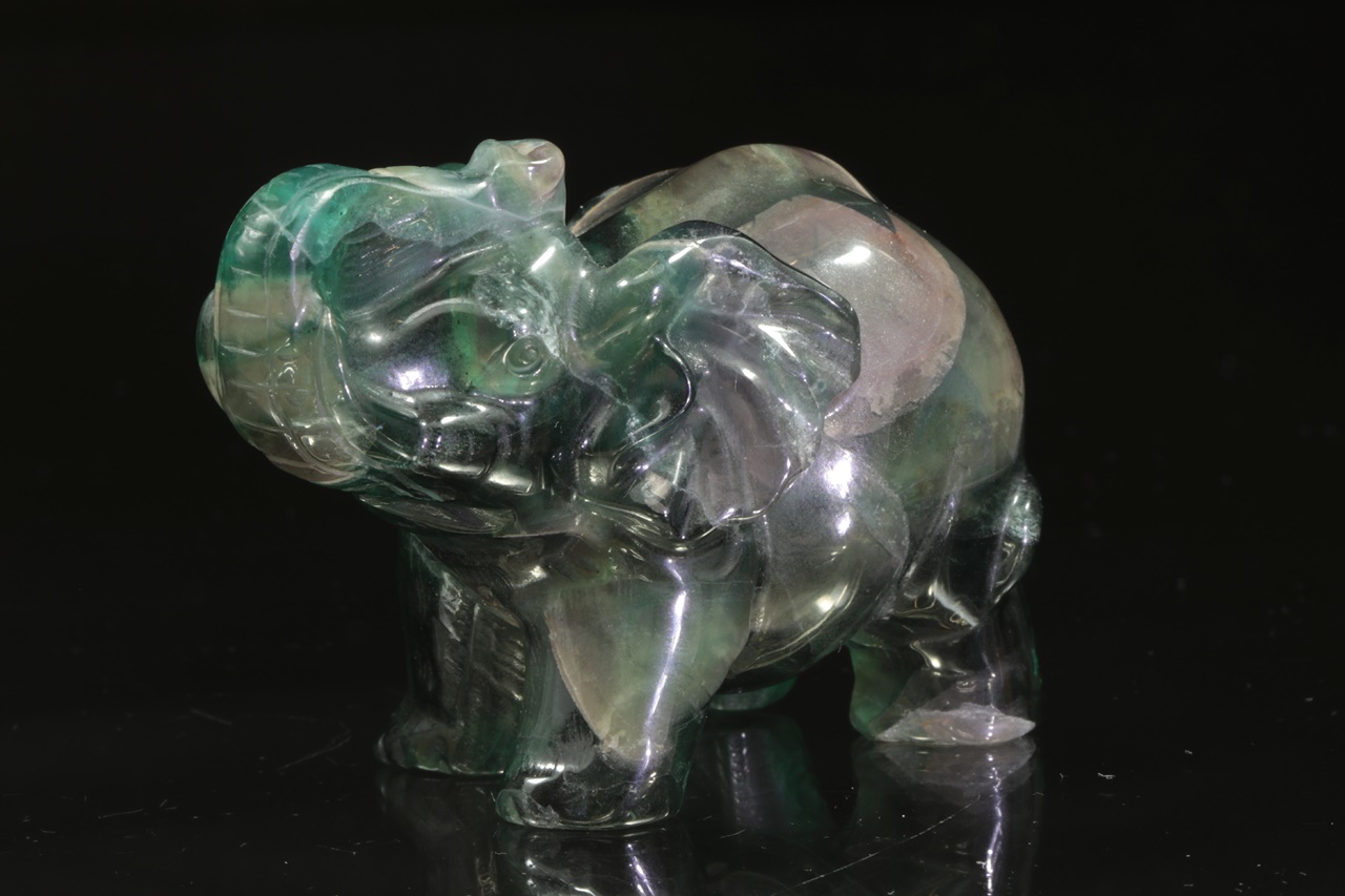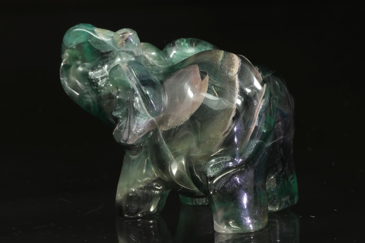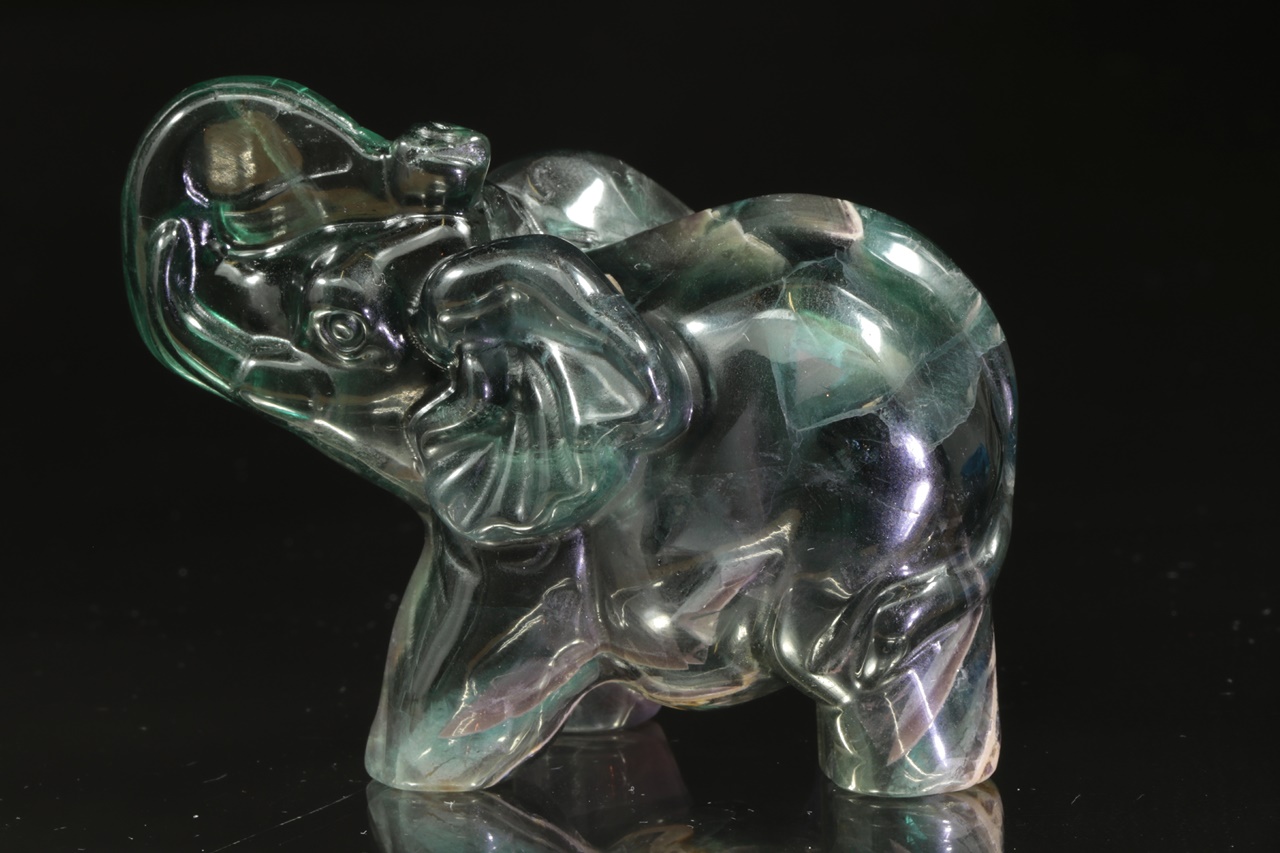 Figurka slona se vztyčeným chobotem pro štěstí zhotovená z přírodního, fialovo zeleného fluoritu .