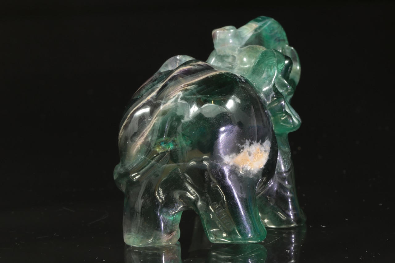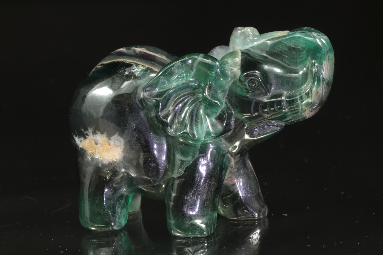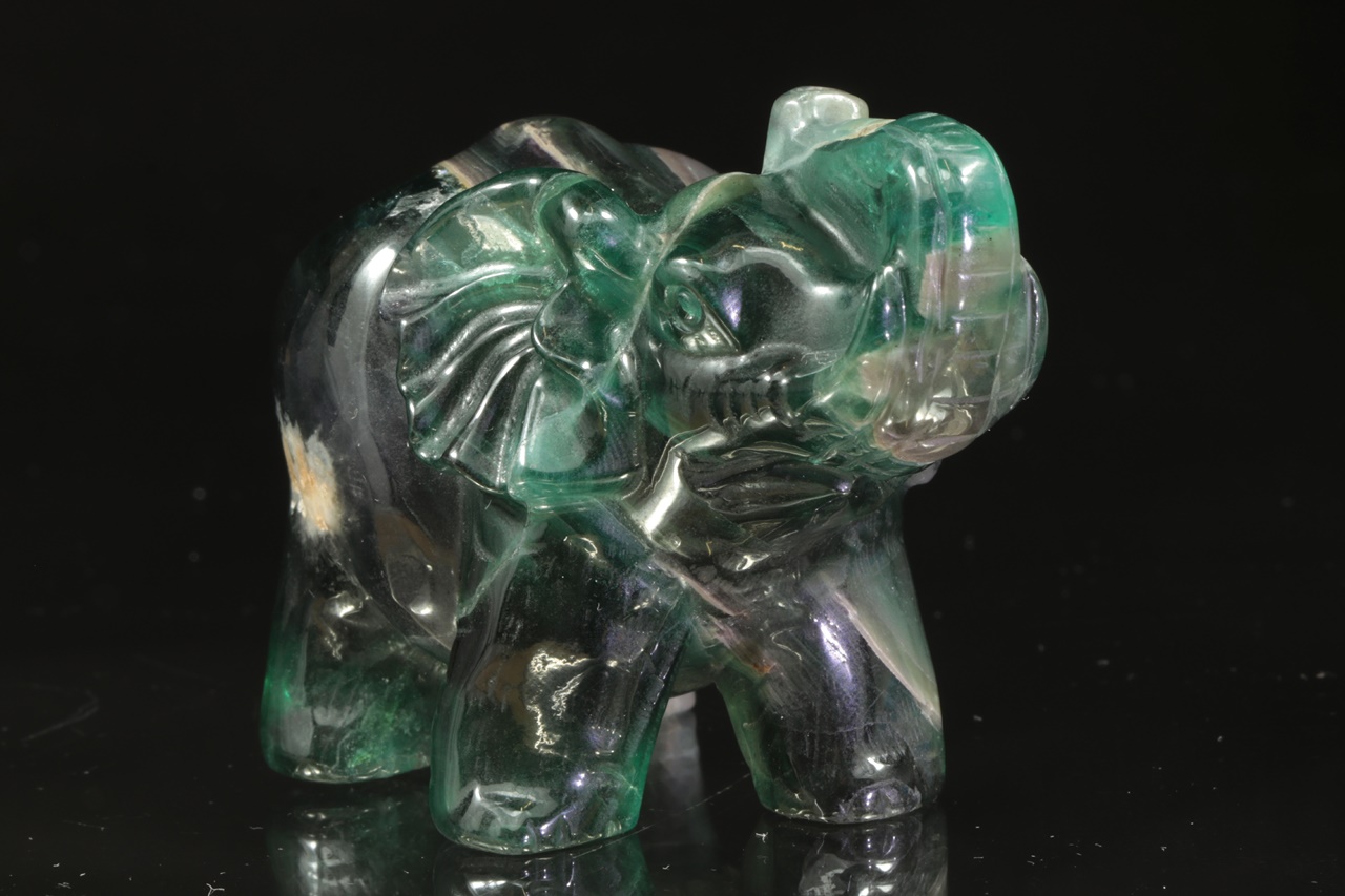 Figurka slona se vztyčeným chobotem pro štěstí zhotovená z přírodního, fialovo zeleného fluoritu .