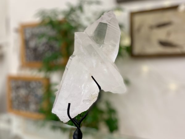 Nádherná ukázka křišťálu. Vzorek tvoří hlavní dva krystaly, které srůstají v harmonické kompozici. Vzorek je uchycený v černém, kovovém stojánku, který je součástí produktu.