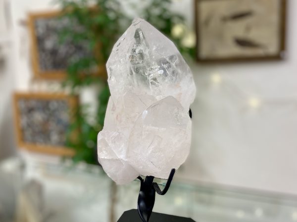 Nádherná velká ukázka křišťálu. Vzorek tvoří hlavní velký krystal, obklopený menšími. Vzorek je uchycený v černém, kovovém stojánku, který je součástí produktu.