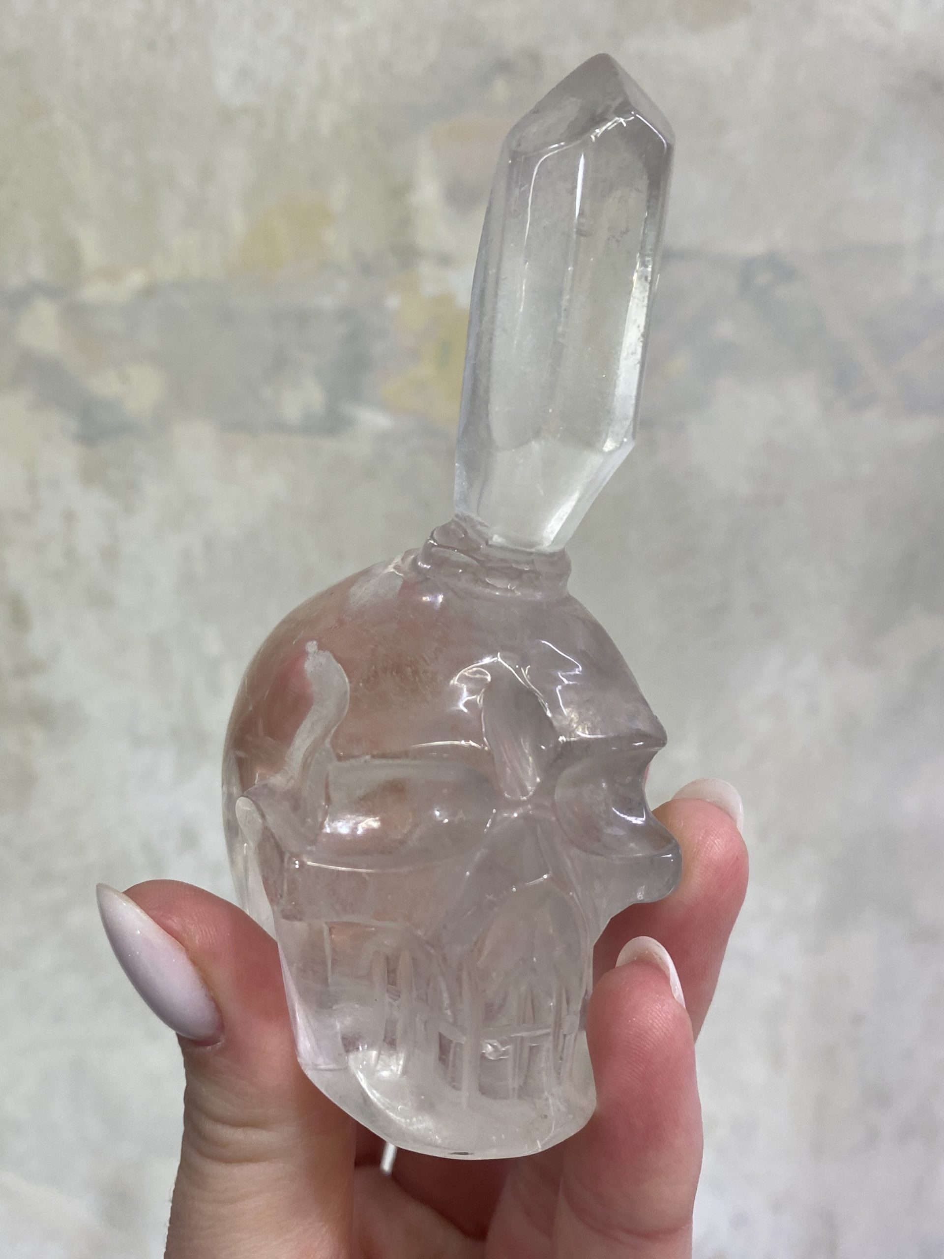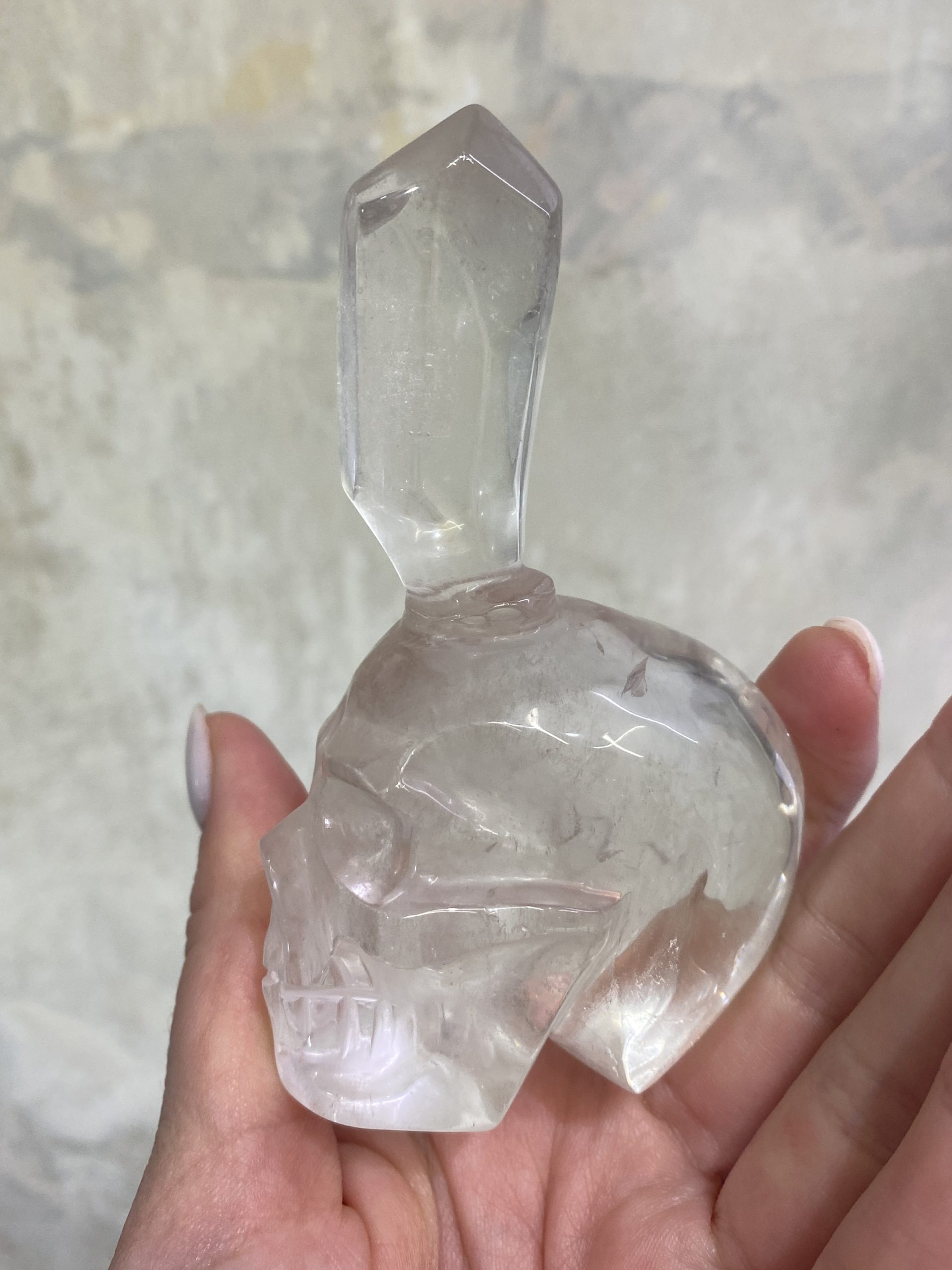 Nádherná pozoruhodná křišťálová lebka s vyřezaným krystalem v čelní části.