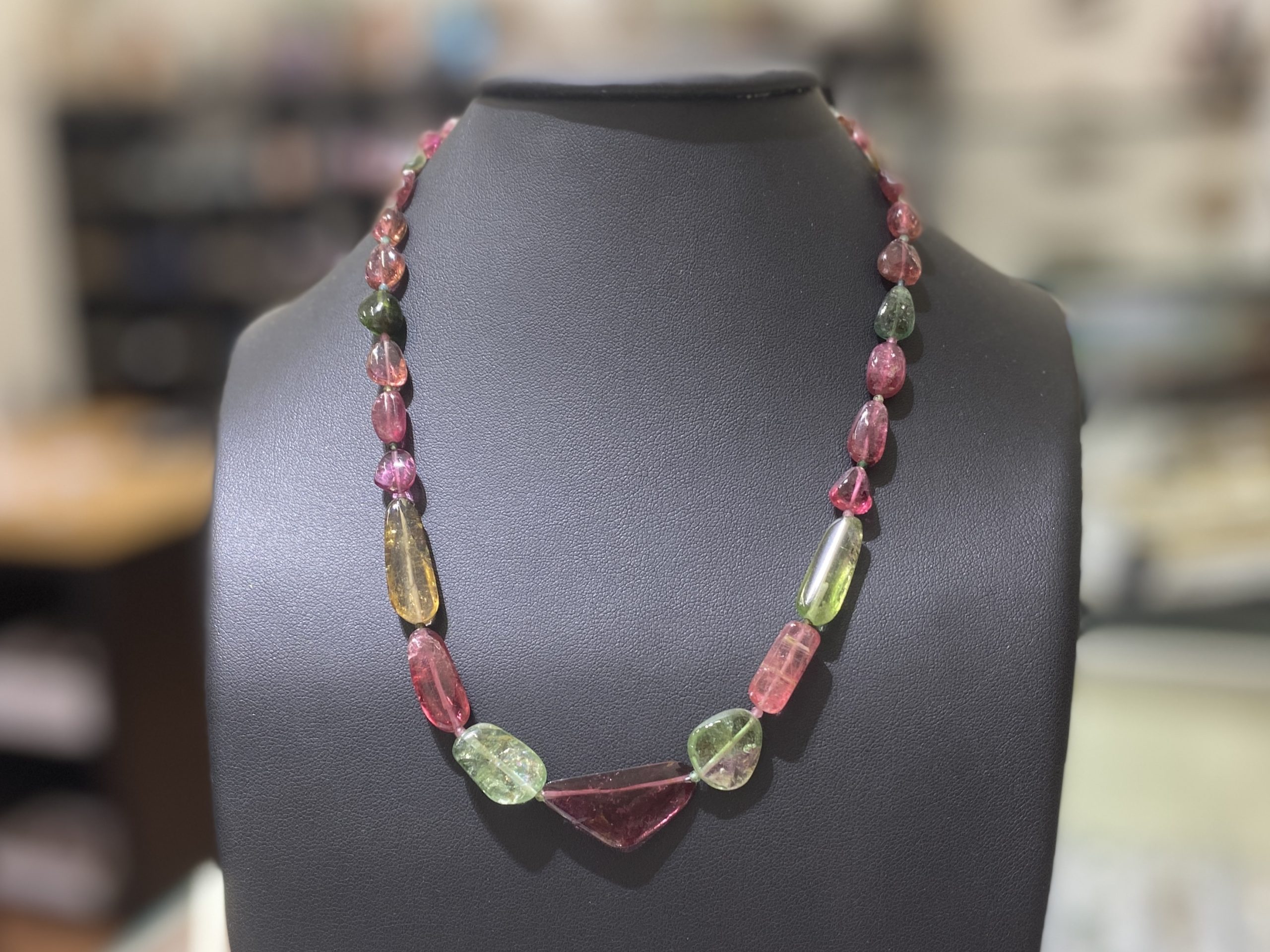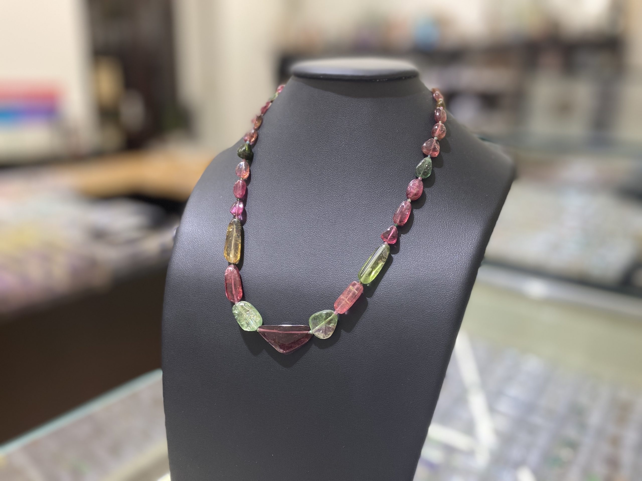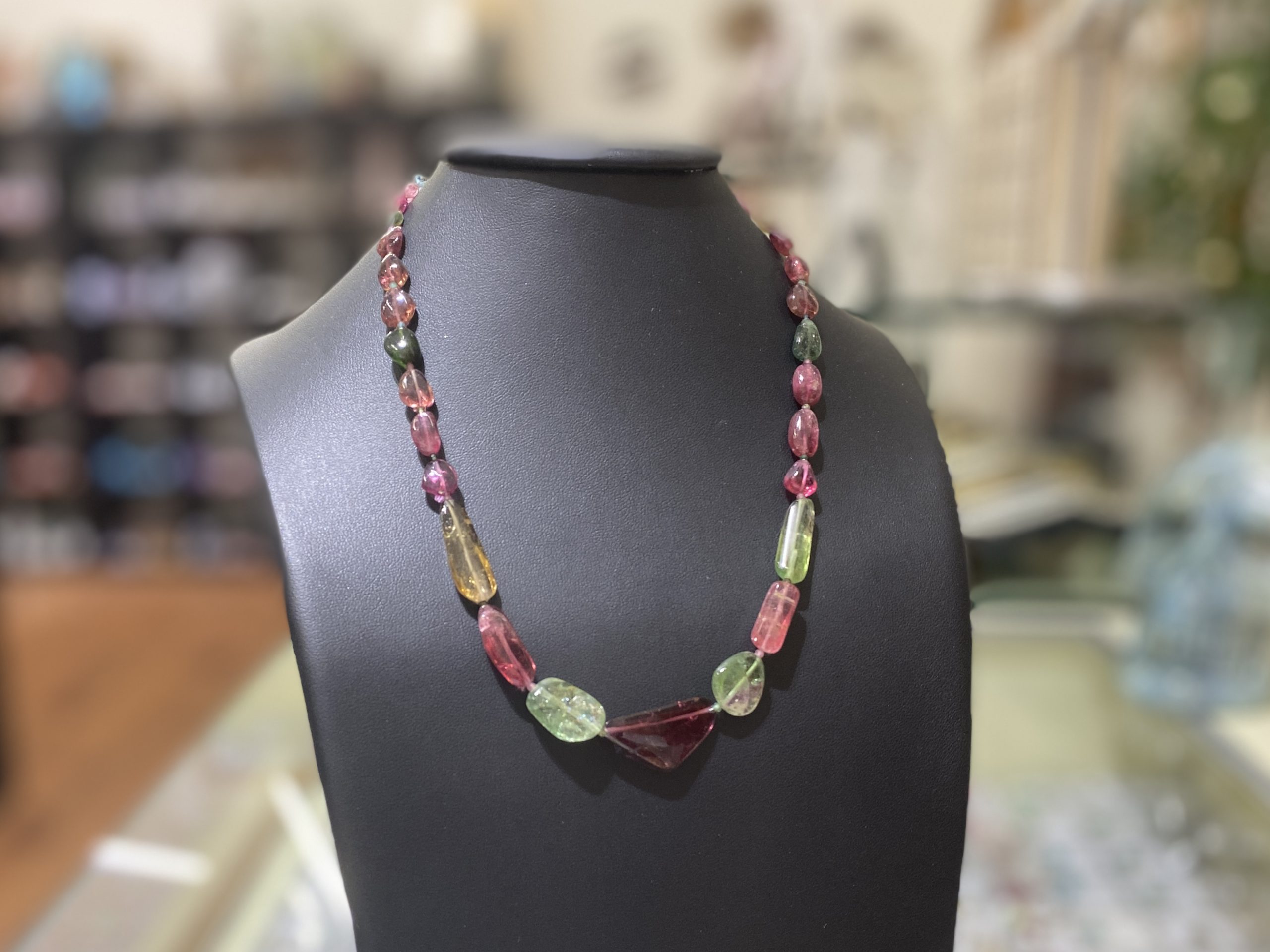 Naprosto úžasný a jedinečný náhrdelník z krásné kombinace různých odstínů, tvarů a velikostí turmalínu, od luxusní trávově zelené, přes medově žlutou až k silné, ale stále něžné růžové. Větší turmalíny jsou proloženy malými, něžnými fasetovanými korálky turmalínu.