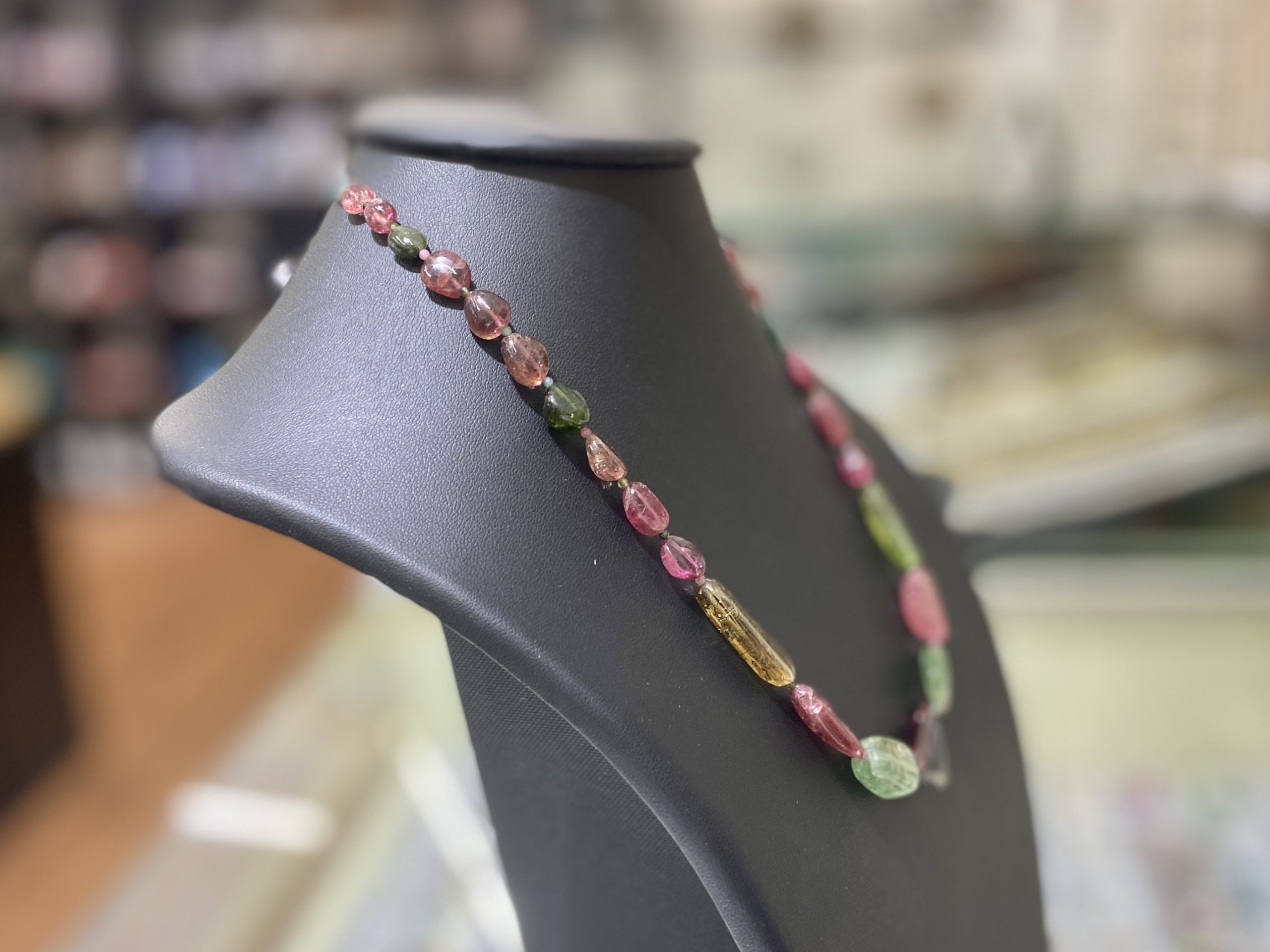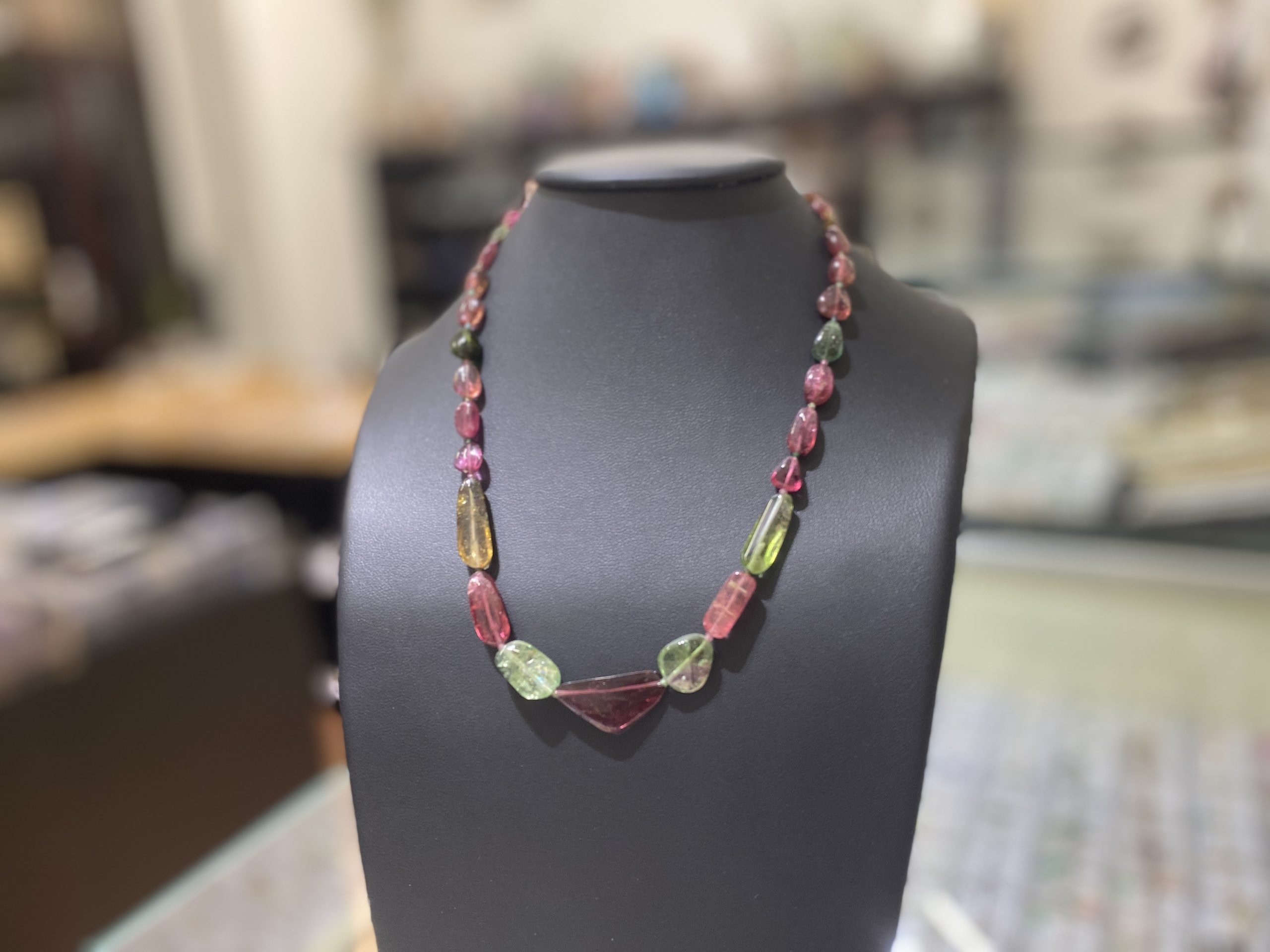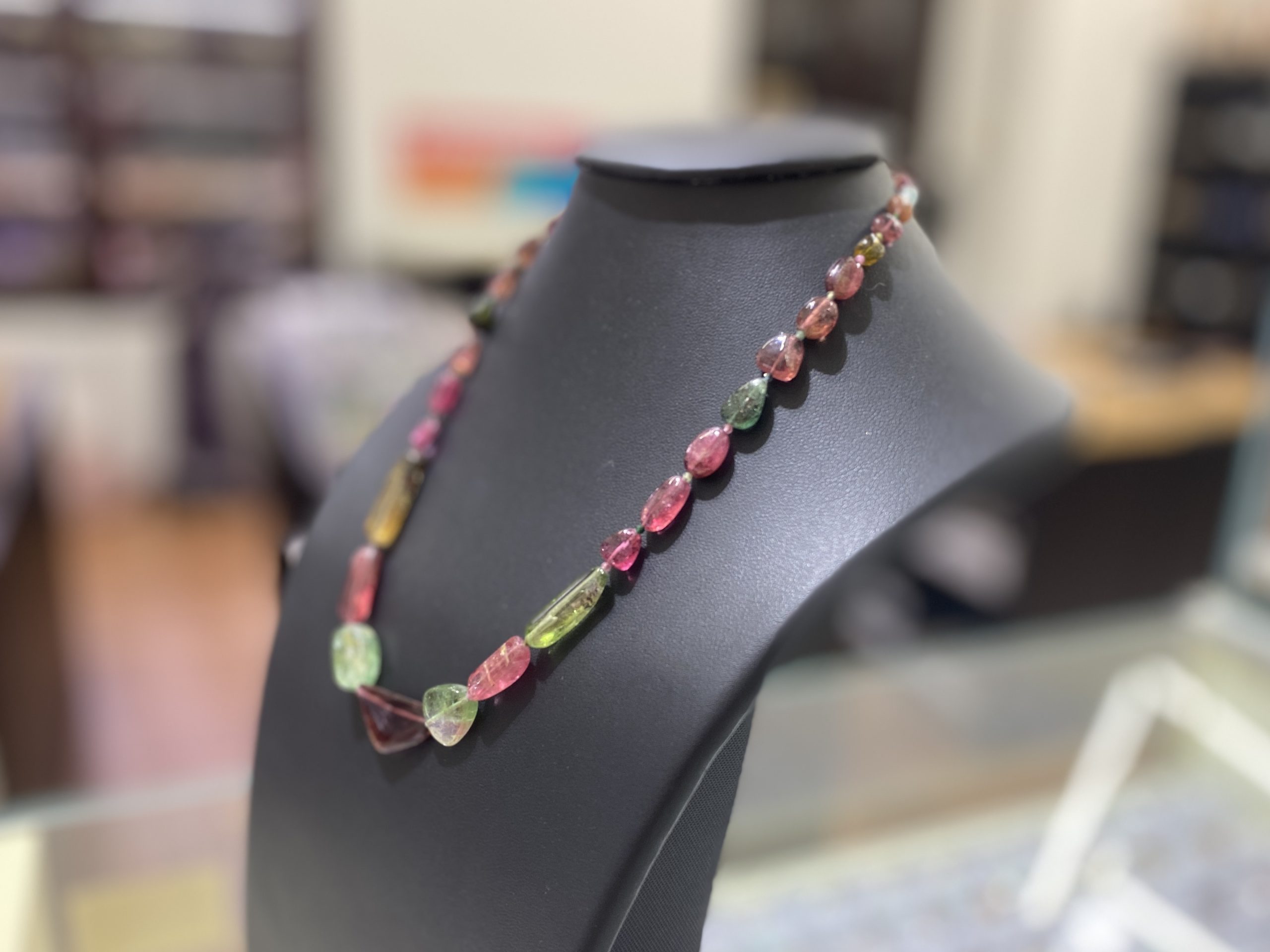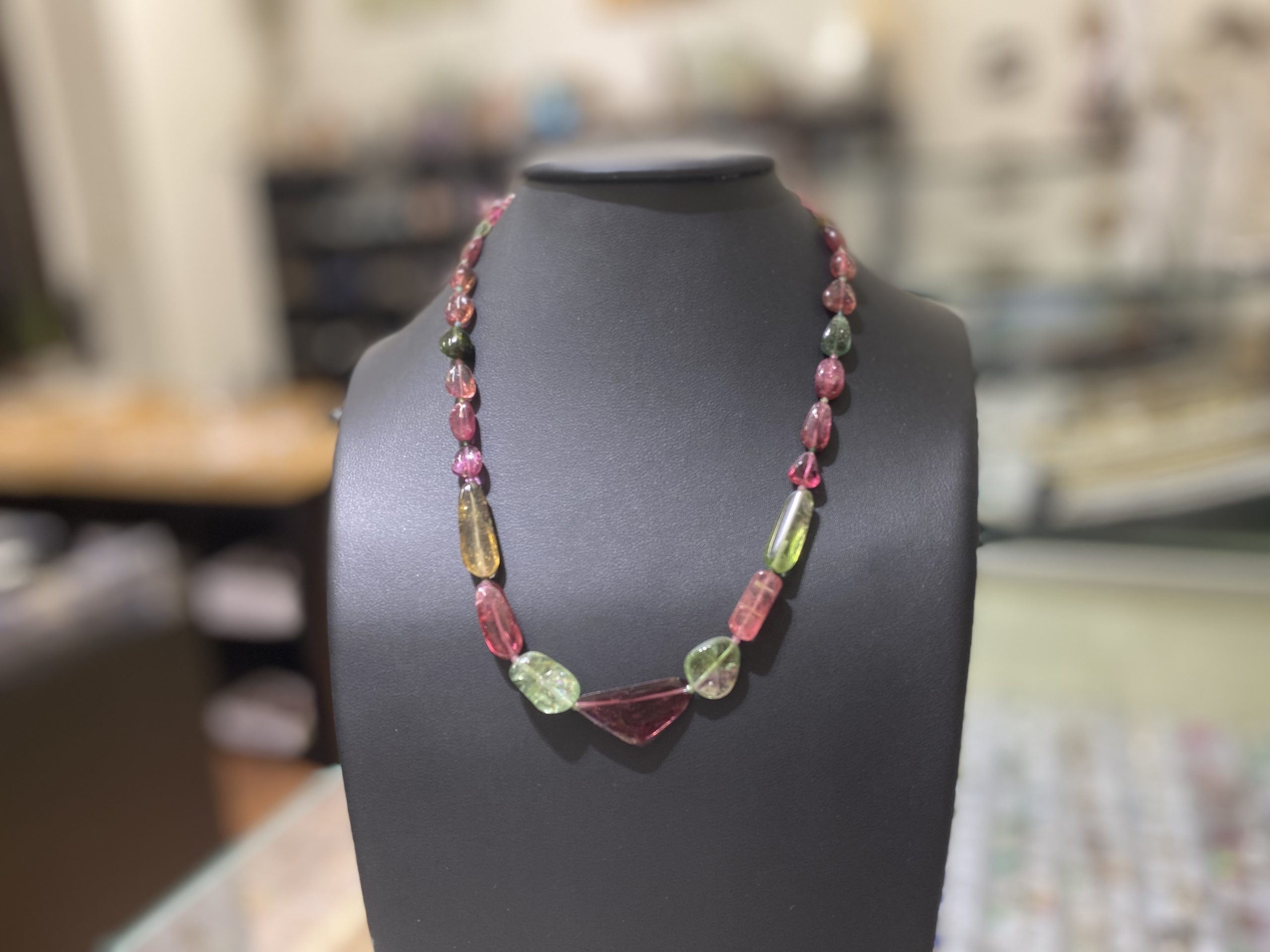 Naprosto úžasný a jedinečný náhrdelník z krásné kombinace různých odstínů, tvarů a velikostí turmalínu, od luxusní trávově zelené, přes medově žlutou až k silné, ale stále něžné růžové. Větší turmalíny jsou proloženy malými, něžnými fasetovanými korálky turmalínu.
