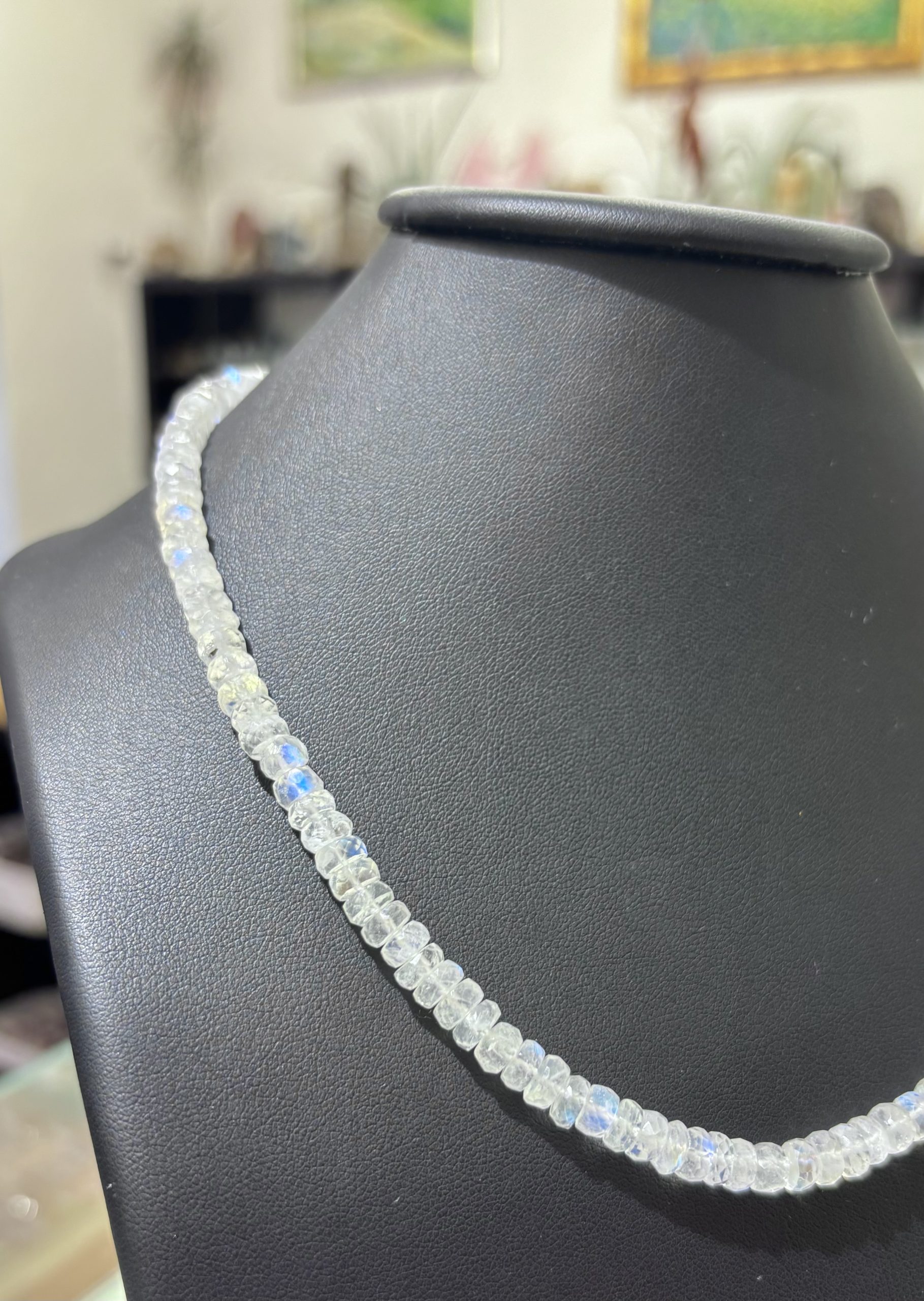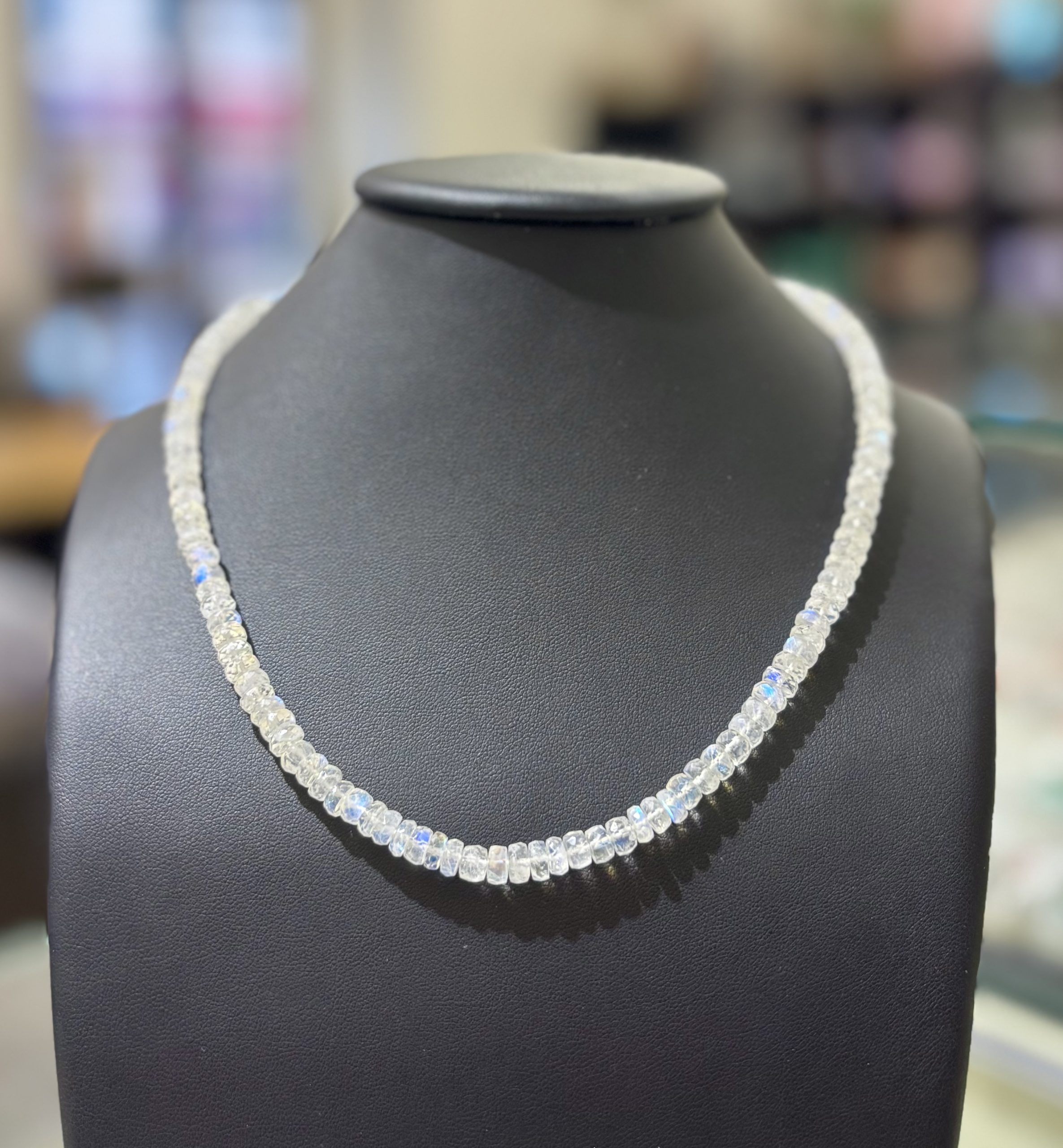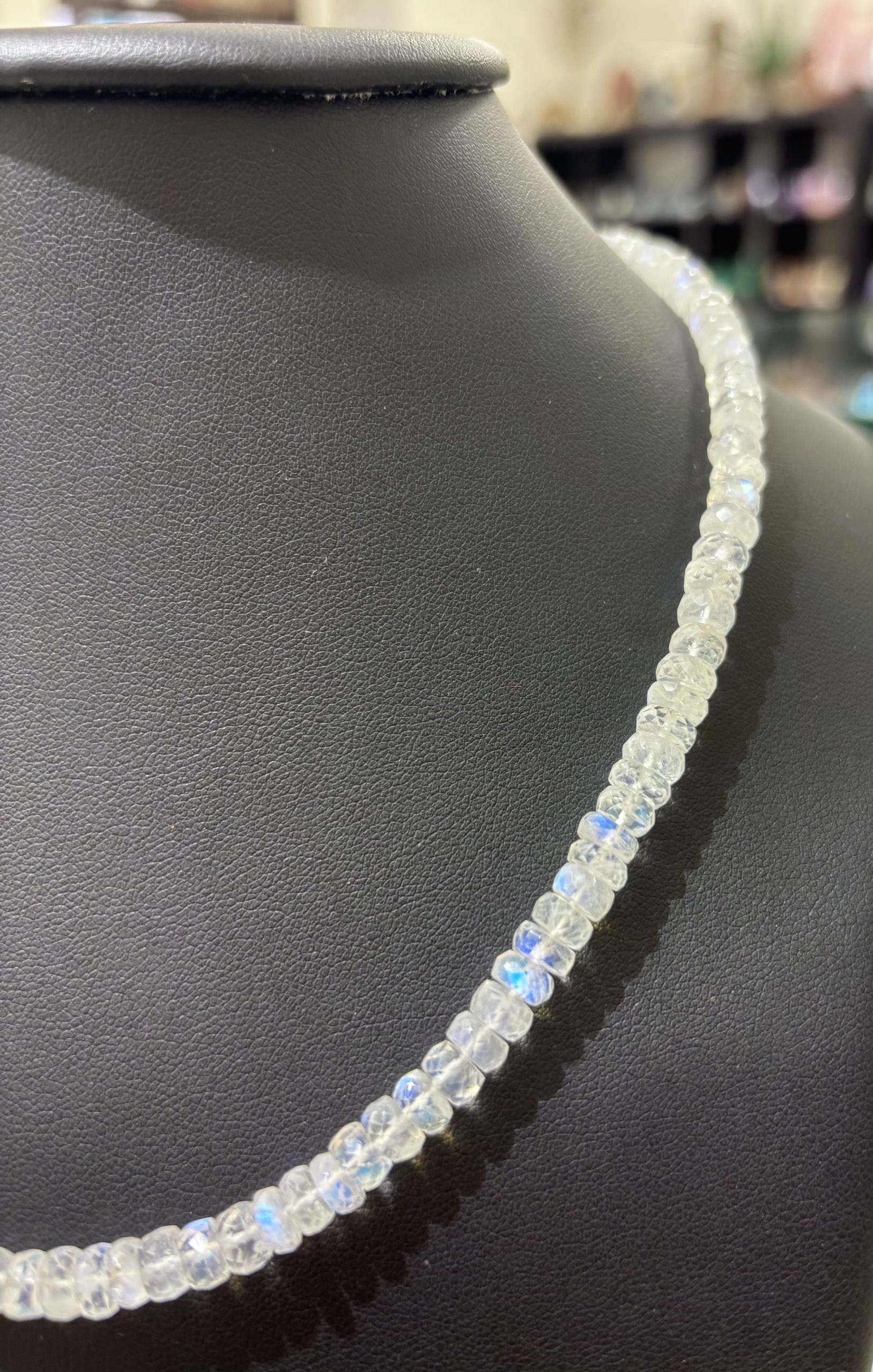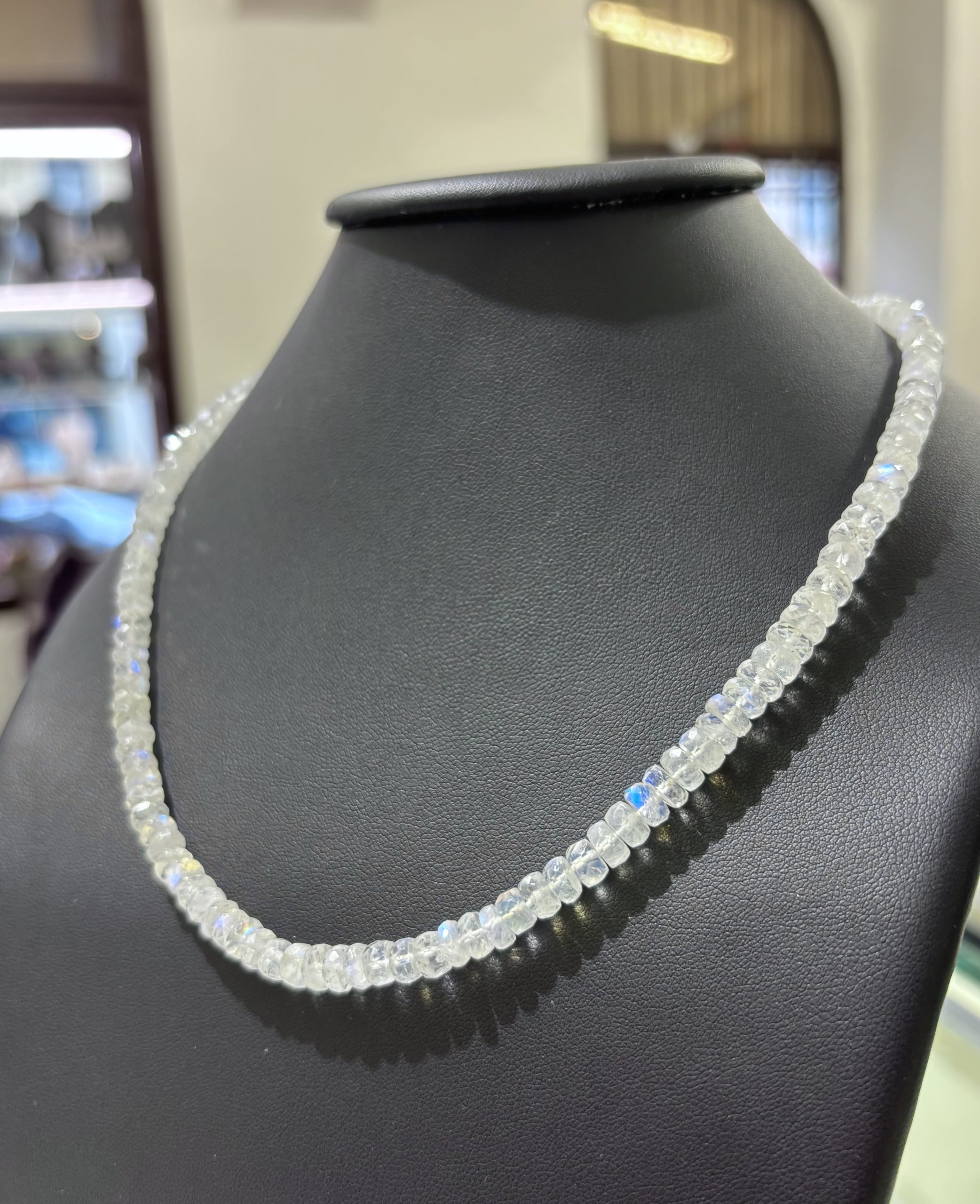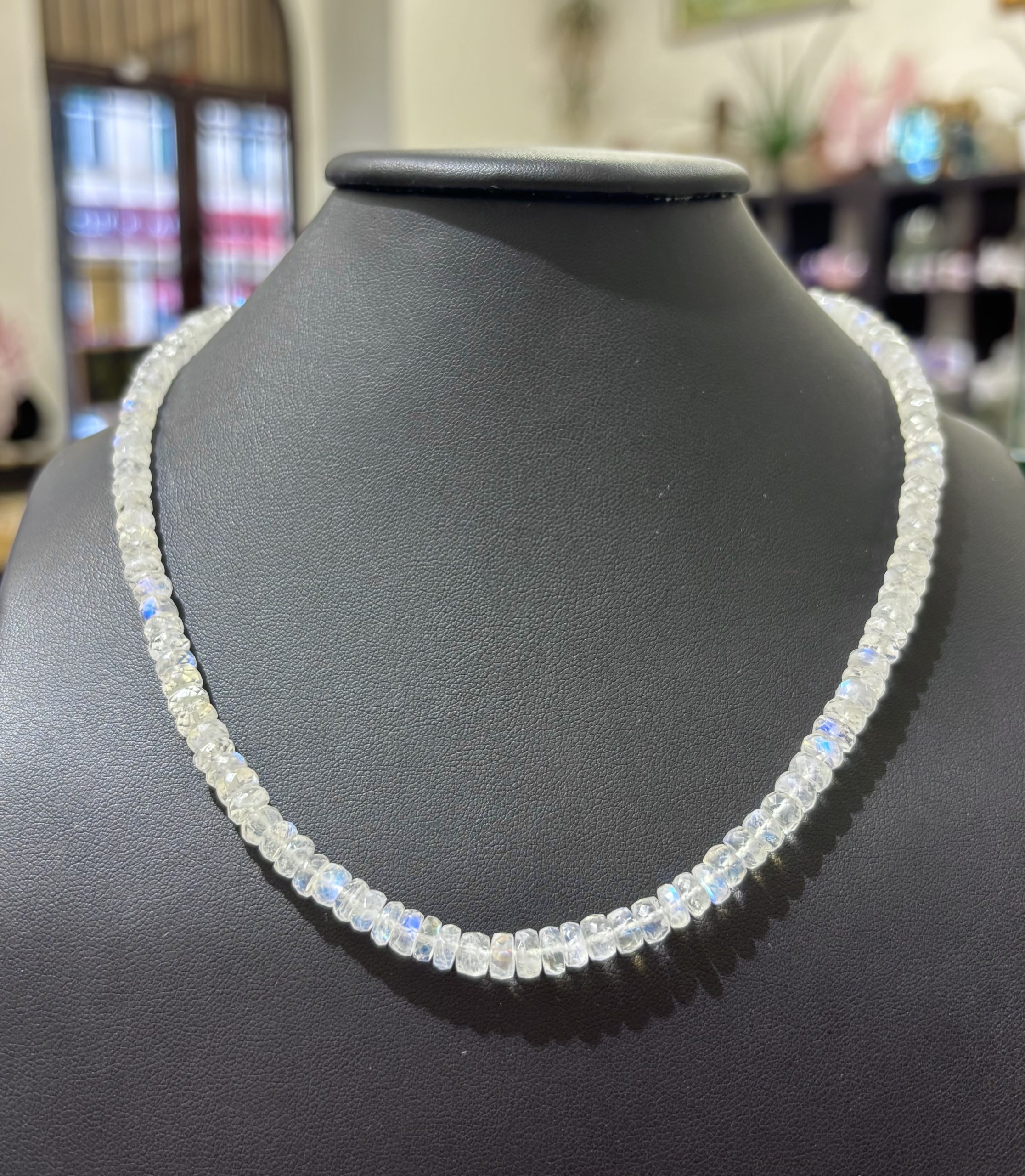 Náhrdelník z měsíčního kamene je elegantním doplňkem pro každodenní nošení. Navíc jeho schopnost iridiscence mu umožňuje vrhat oslňující odlesky sytě modré barvy. Jde o něžný a přece výrazný doplněk.