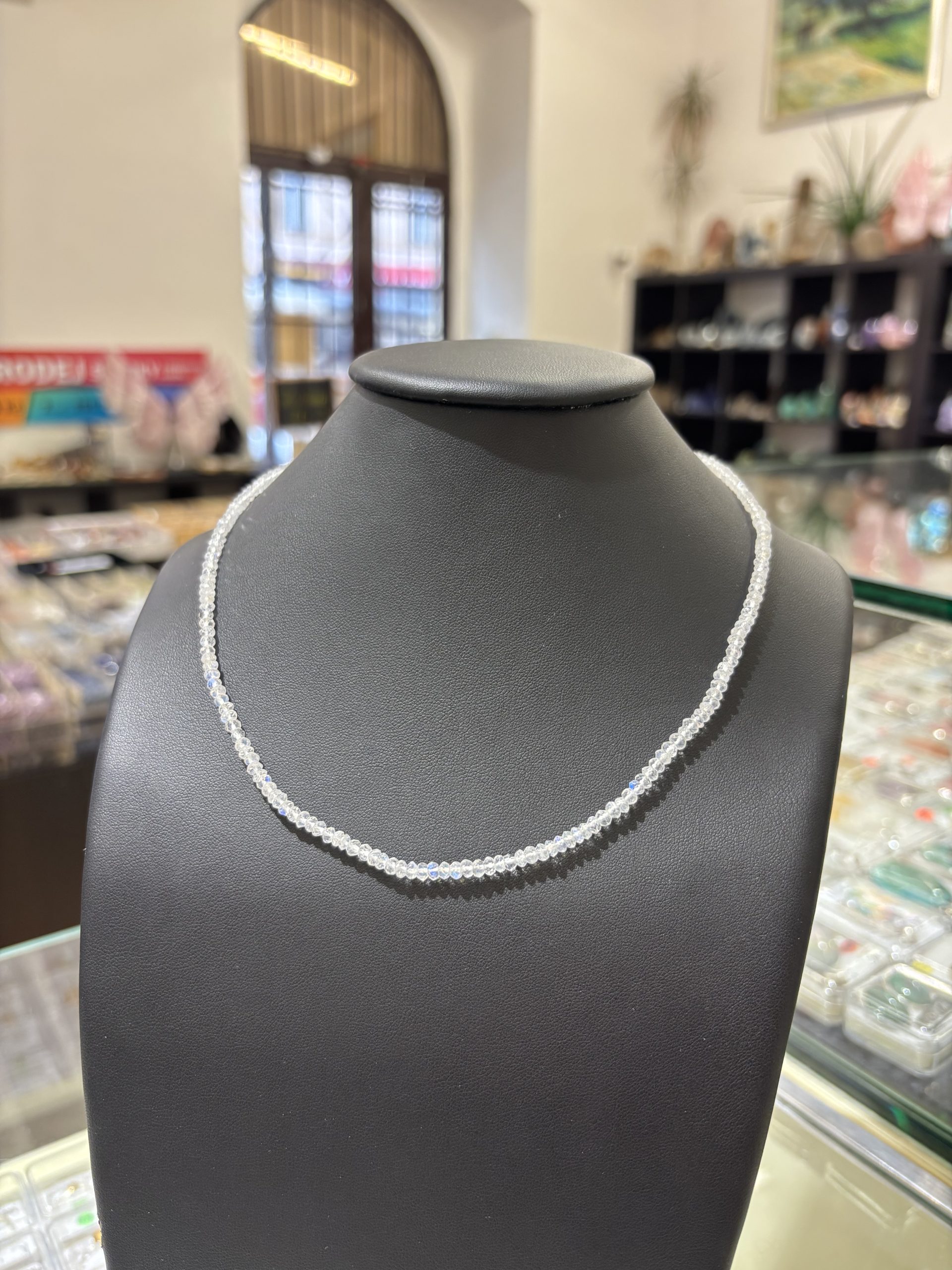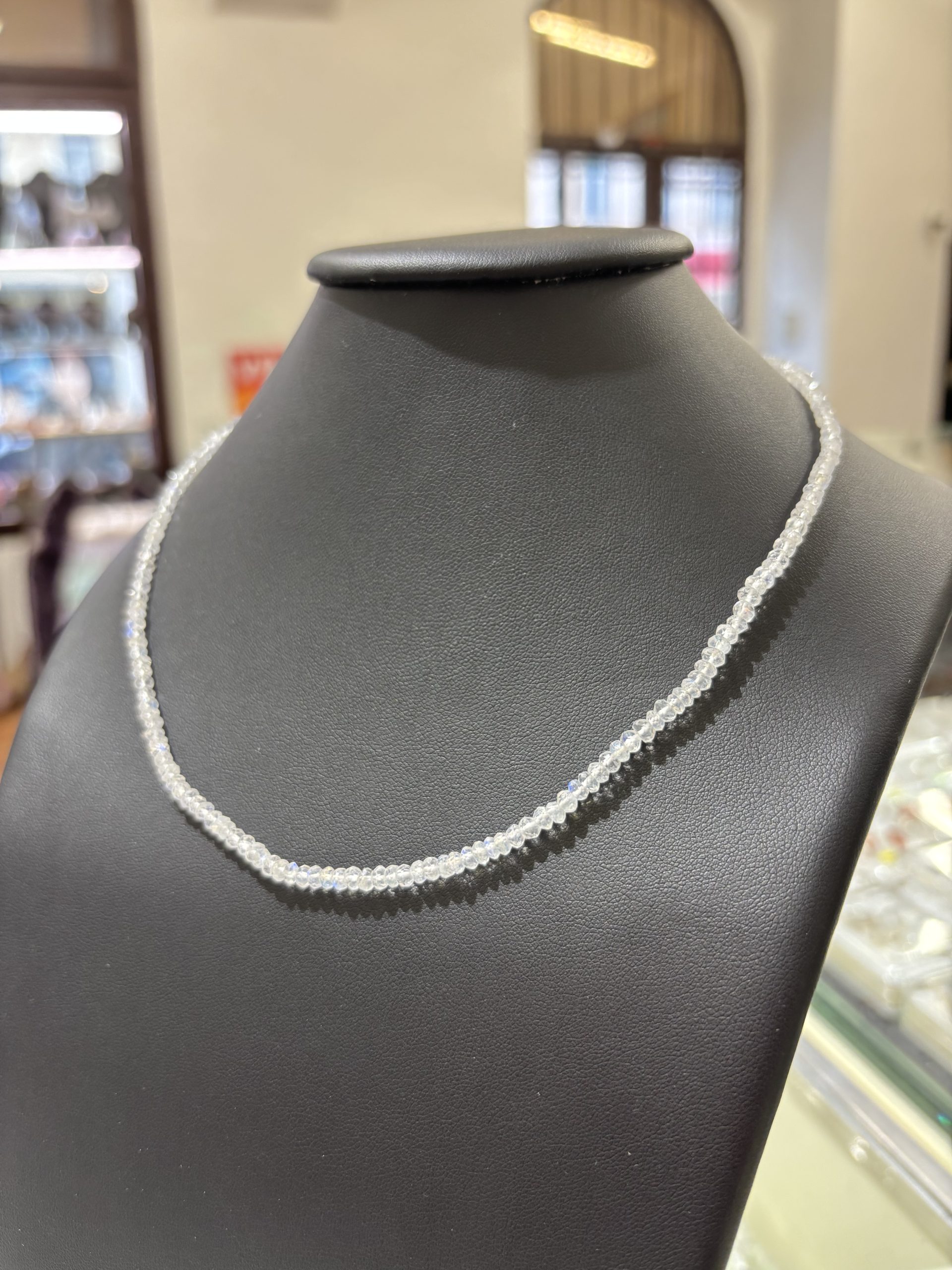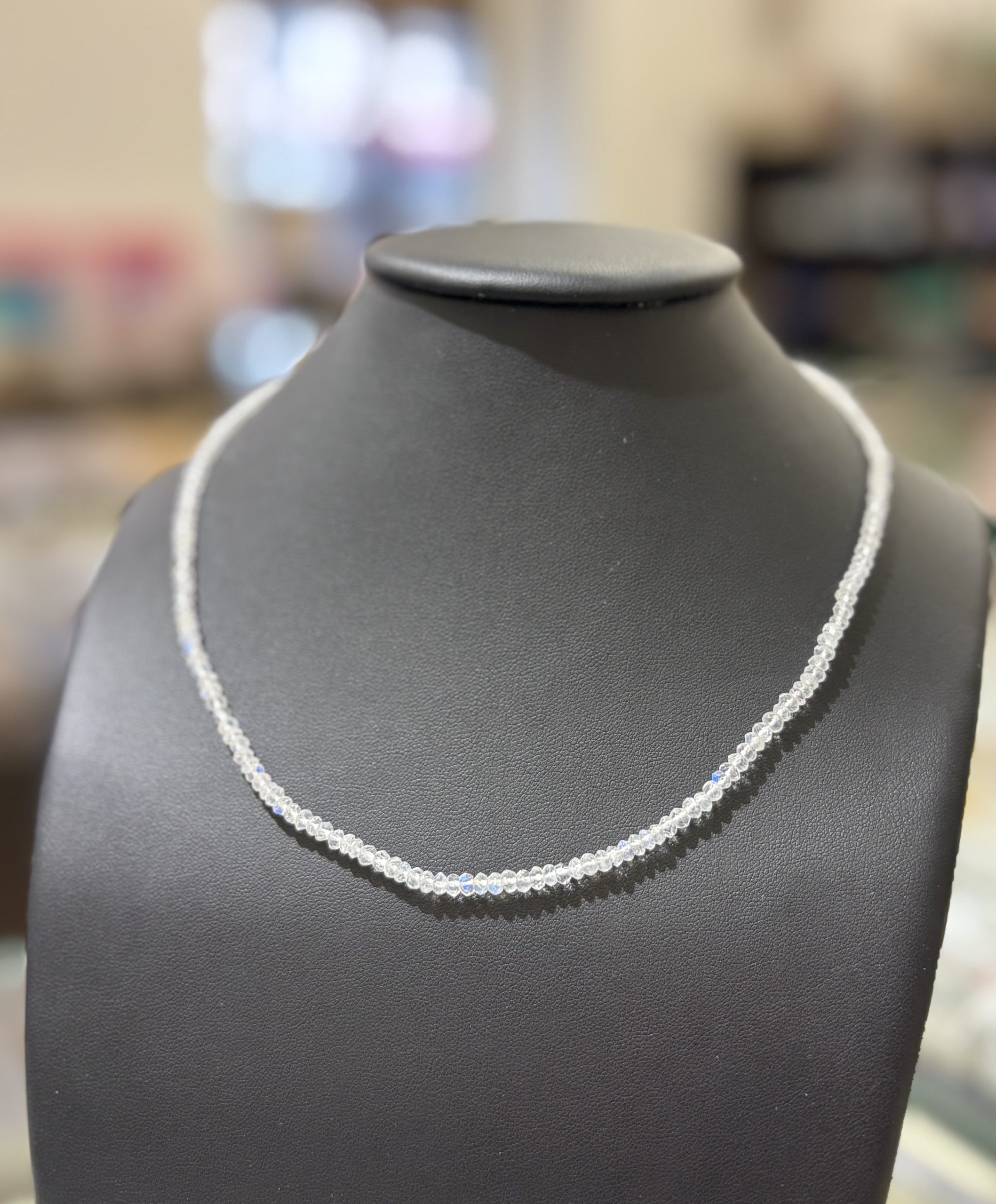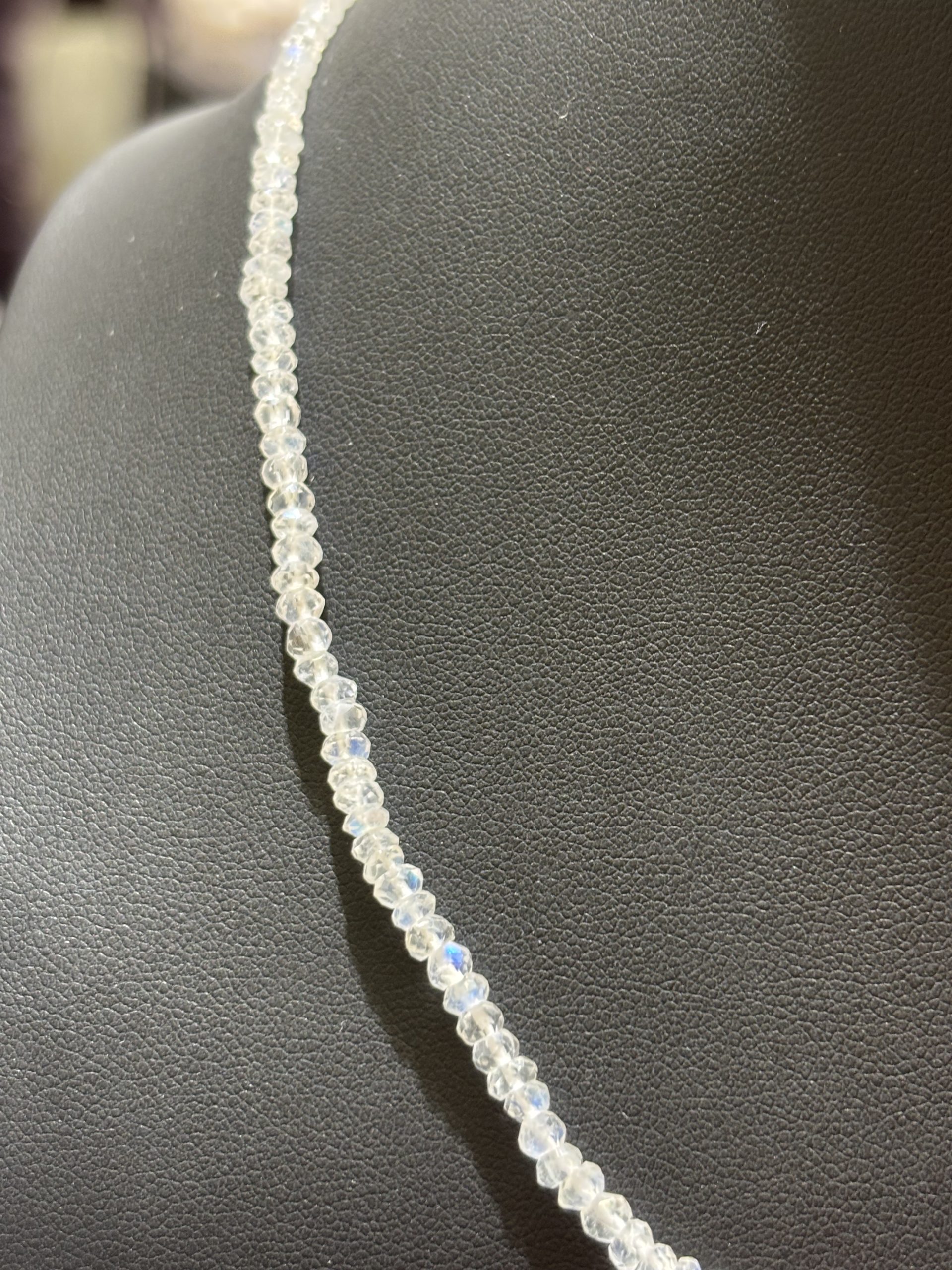 Náhrdelník z měsíčního kamene je elegantním doplňkem pro každodenní nošení. Navíc jeho schopnost iridiscence mu umožňuje vrhat oslňující odlesky sytě modré barvy.
